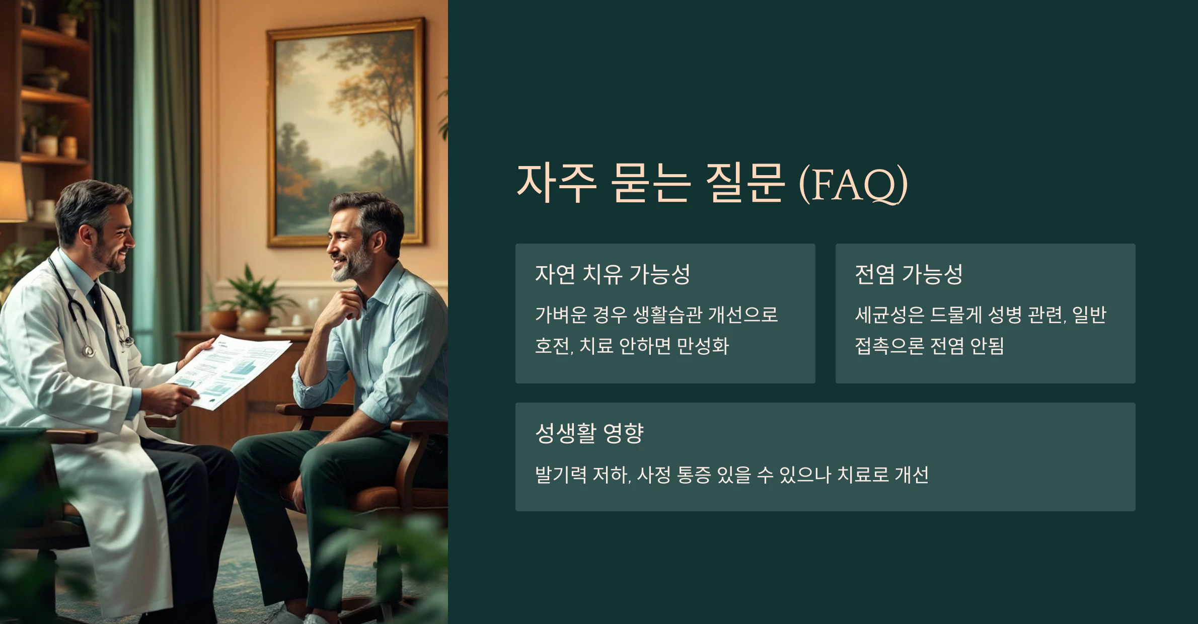 ✅ 발기력 저하나 사정 시 통증이 있을 수 있지만, 치료하면 개선될 수 있어요.