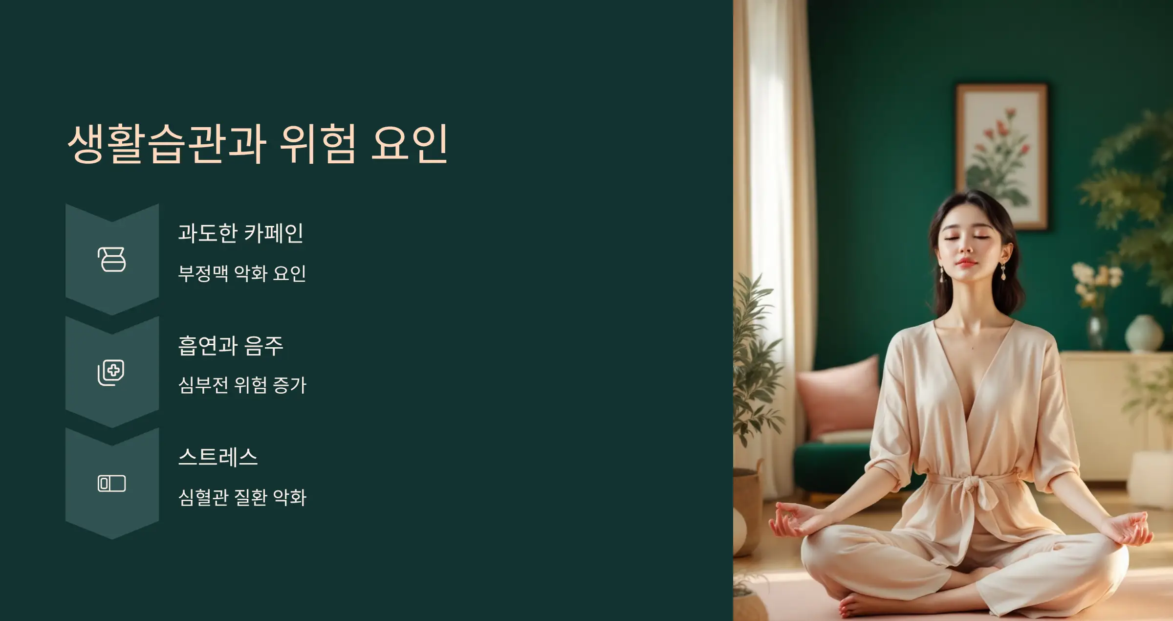 과도한 카페인, 음주, 흡연, 스트레스는 부정맥과 심부전을 악화시킵니다. 🚬🍷 운동 부족이나 반대로 무리한 운동도 증상을 악화시킬 수 있어 조절이 필요합니다. 규칙적인 생활습관 관리가 중요한 이유입니다.