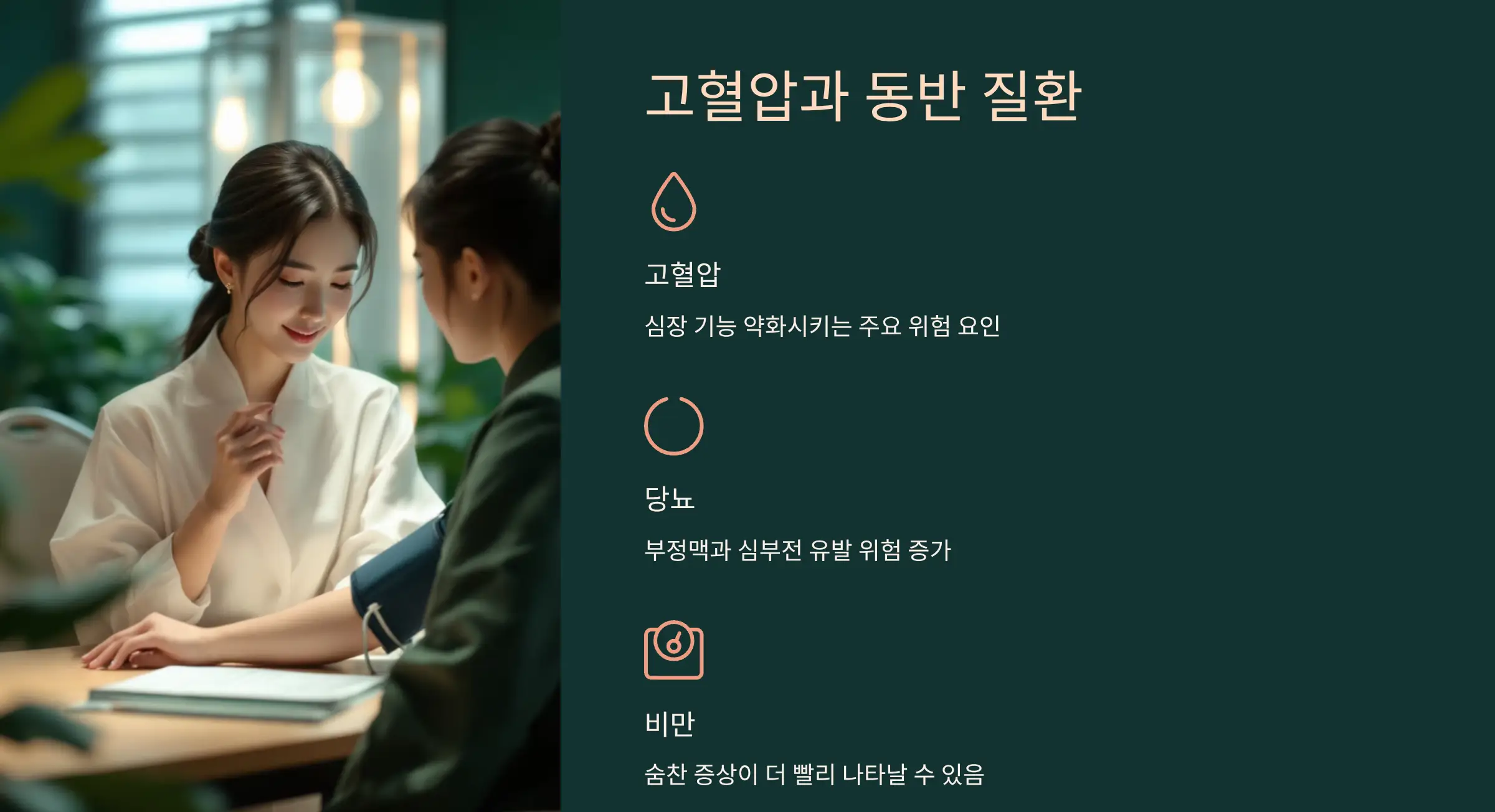 고혈압, 당뇨, 비만 등 만성질환을 가지고 있다면 숨찬 증상이 더 빨리 나타날 수 있습니다. 🩺 이런 질환들은 심장 기능을 약화시키고 부정맥이나 심부전을 유발할 위험 요인이 됩니다.