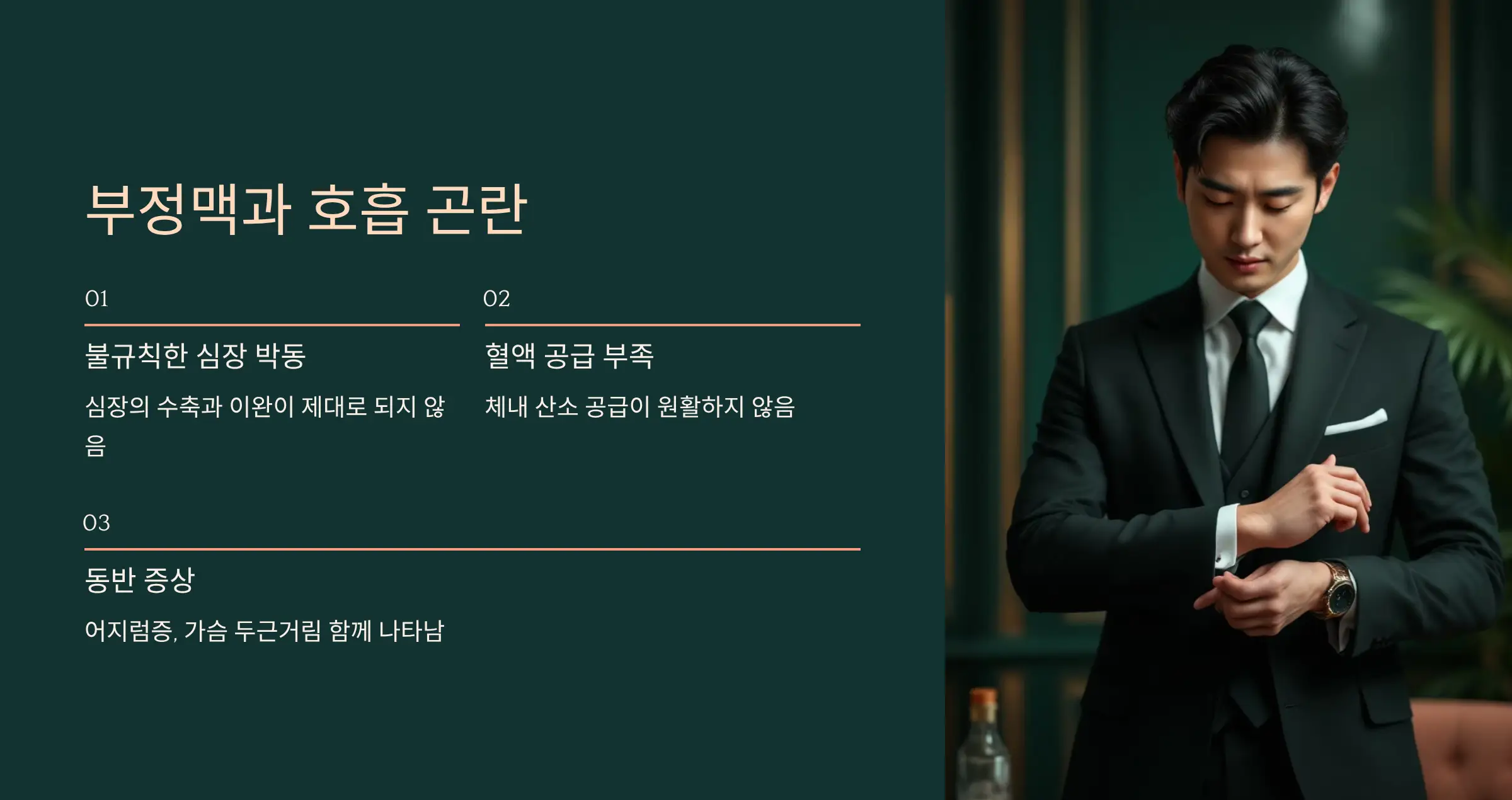 부정맥은 심장의 박동이 불규칙해지는 질환으로, 심장이 제대로 수축과 이완을 하지 못해 혈액을 충분히 내보내지 못합니다. ⏱️ 그 결과 체내에 산소 공급이 원활하지 않아 걷거나 계단을 오를 때 쉽게 숨이 차고 어지럼증, 가슴 두근거림이 함께 나타날 수 있습니다.