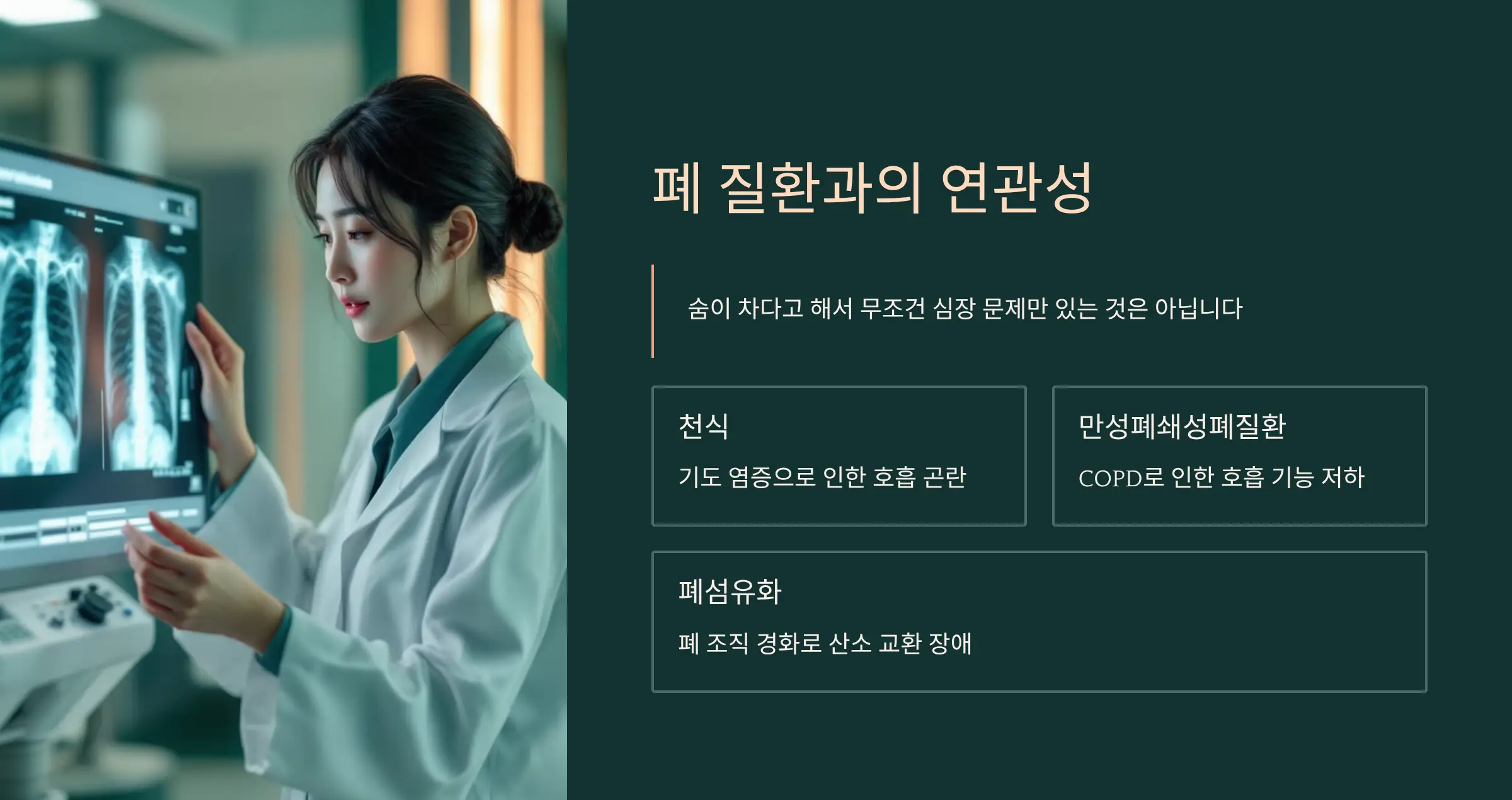 숨이 차다고 해서 무조건 심장 문제만 있는 것은 아닙니다. 천식, 만성폐쇄성폐질환(COPD), 폐섬유화 같은 폐 질환도 호흡 곤란의 주요 원인입니다. 🫀 따라서 정확한 원인을 알기 위해서는 심장과 폐를 모두 진단받는 것이 필요합니다.
