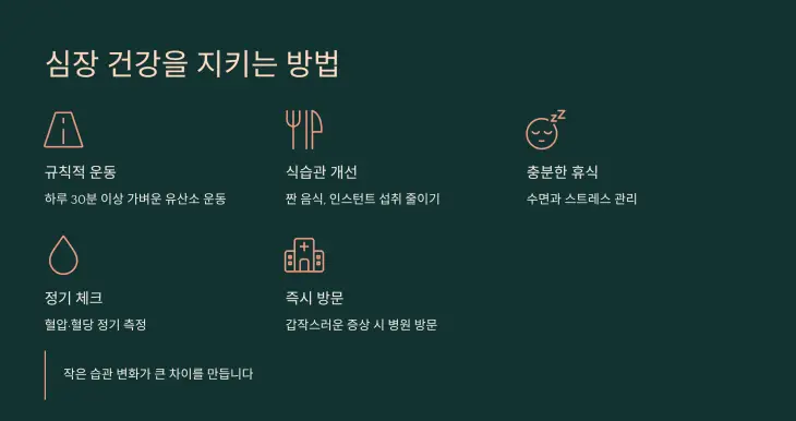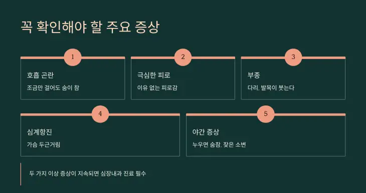 이 중 두 가지 이상이 지속된다면, 단순 피로나 스트레스가 아닌 심장 질환의 신호로 의심해야 합니다.