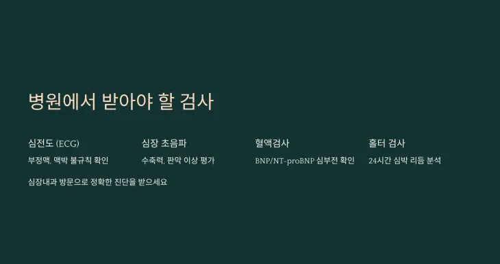 심부전과 부정맥은 단순 청진만으로는 진단이 어렵기 때문에, 다음과 같은 검사가 필요합니다.