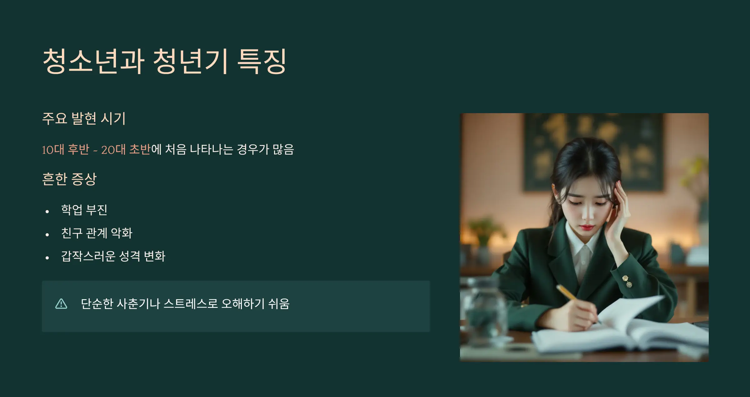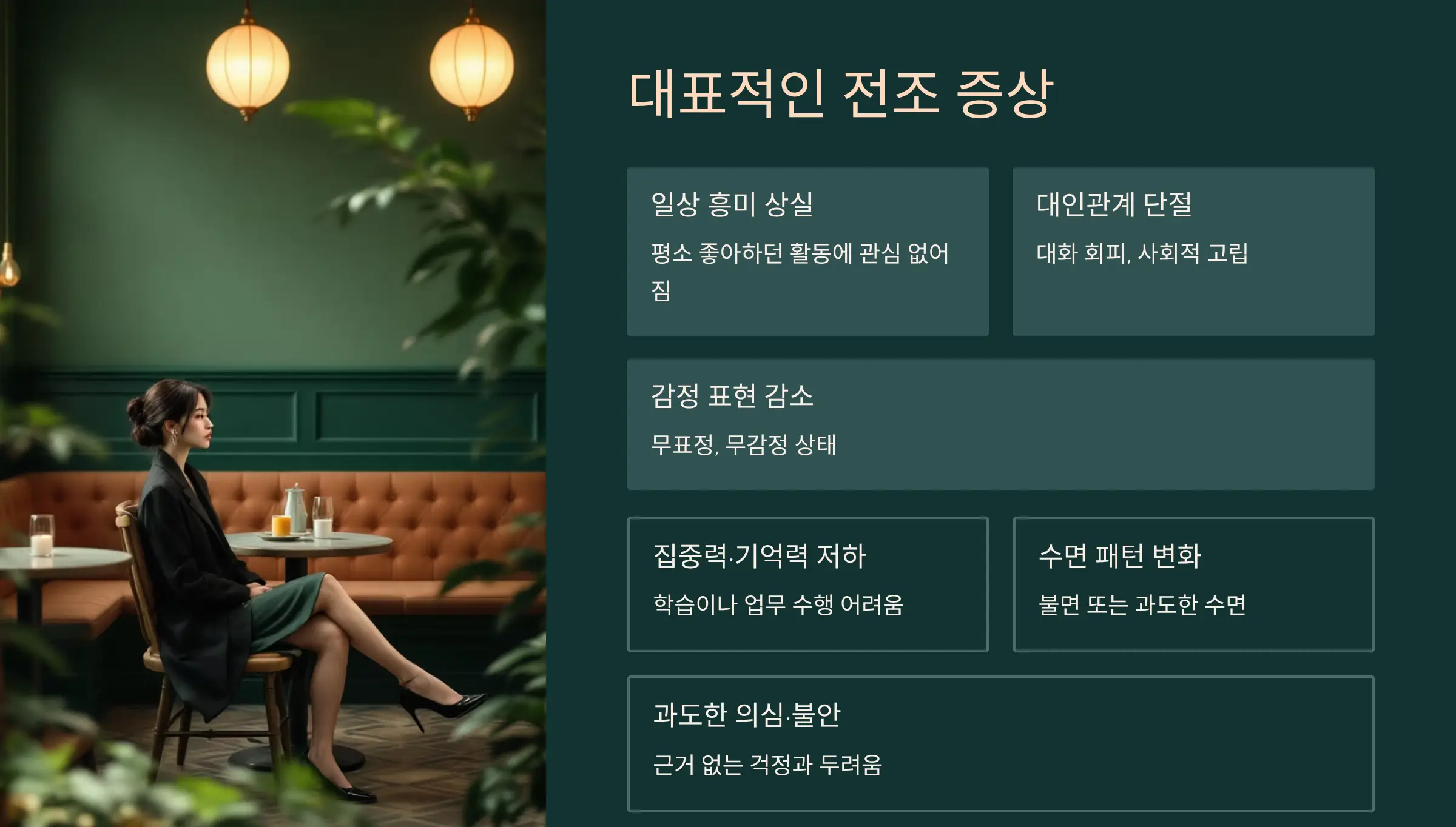 전조 증상은 매우 다양하고 미묘해서 다른 정신질환과 혼동되기 쉽습니다. 대표적인 신호는 다음과 같아요.