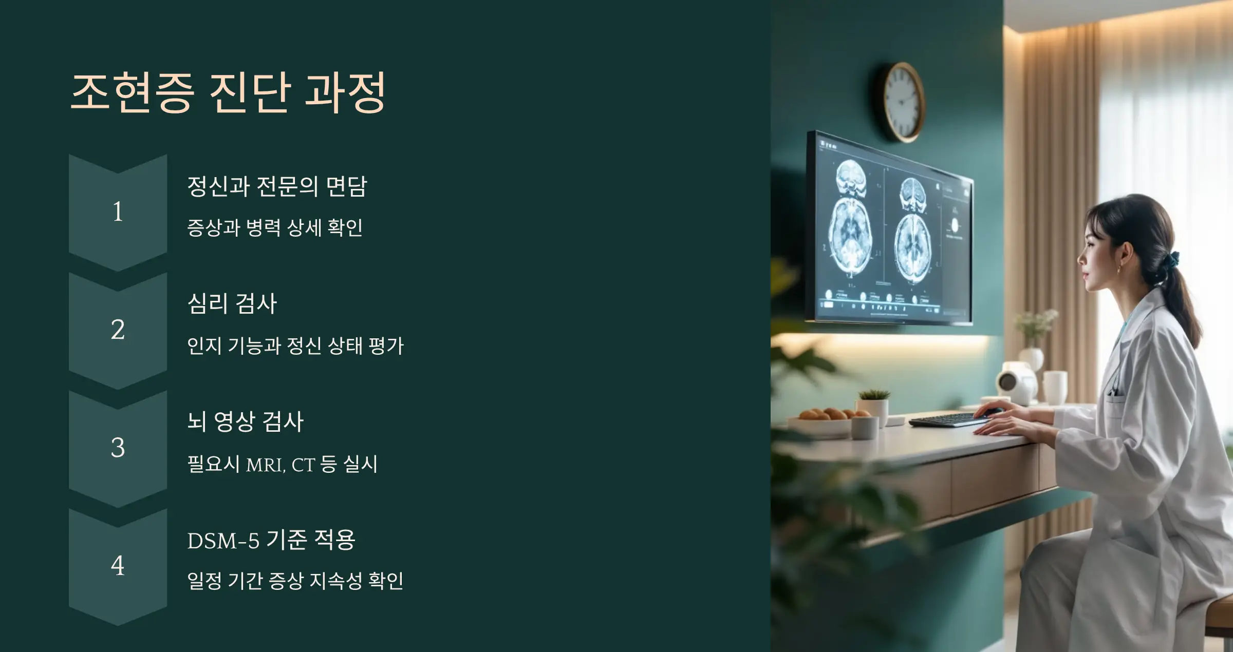 조현증 진단은 단순히 한 번의 검사로 끝나는 것이 아닙니다. 정신과 전문의의 면담, 심리 검사, 뇌 영상 검사 등이 함께 이루어질 수 있습니다. 특히 DSM-5(정신질환 진단 및 통계 편람) 기준에 따라 일정 기간 동안 특정 증상이 지속적으로 나타나는지를 확인합니다. 진단 과정은 철저히 전문의의 평가에 의존하기 때문에, 스스로 단정 짓지 않고 전문적인 진료를 받는 것이 가장 중요합니다.