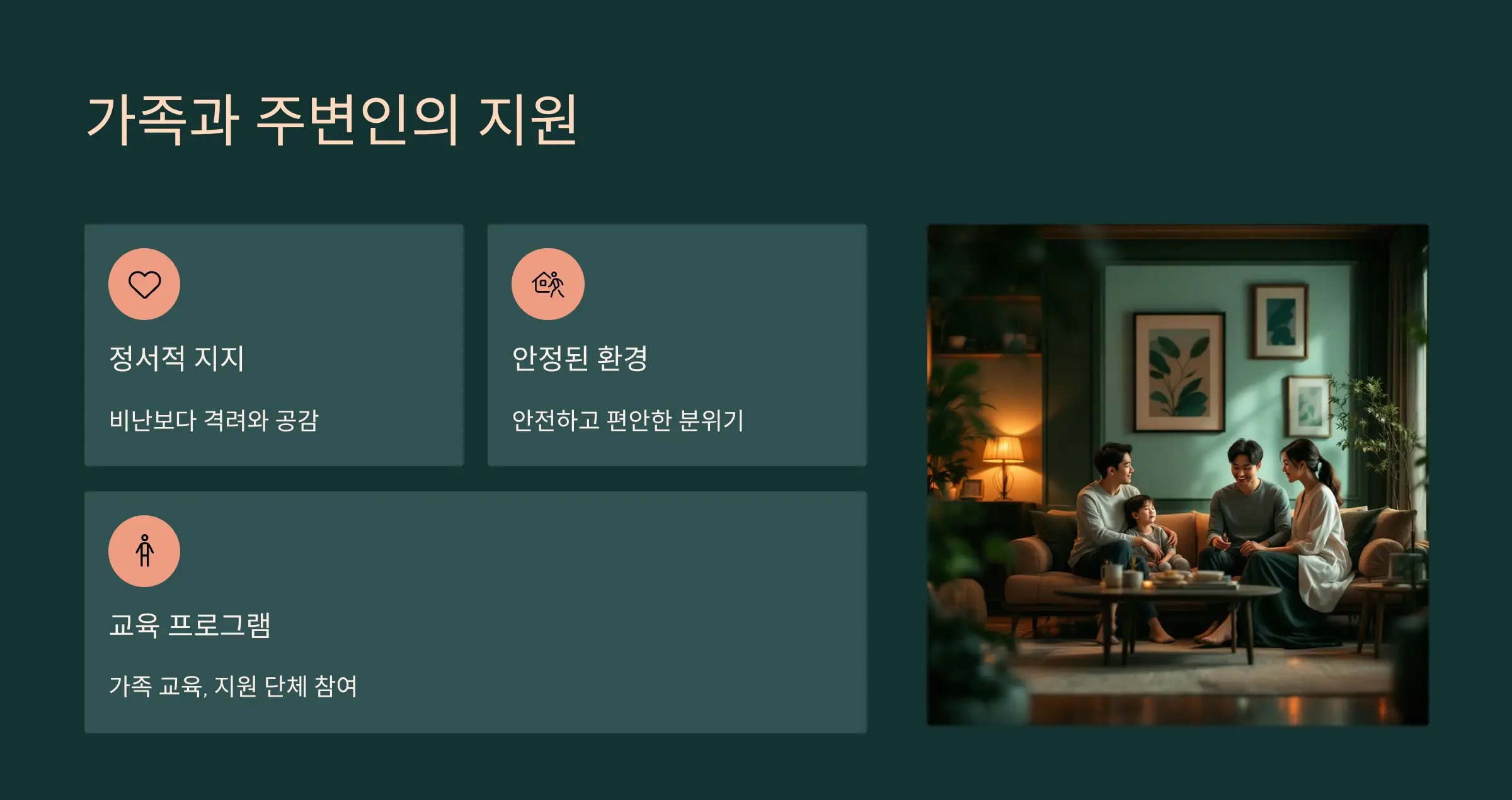 가족과 주변인의 태도는 환자의 회복에 결정적 영향을 줍니다. 환자를 비난하거나 강압적으로 대하기보다는, 안전하고 안정된 환경을 제공하고 꾸준히 격려하는 것이 필요합니다. 정서적 지지를 통해 환자가 치료 과정을 포기하지 않도록 돕는 것이 핵심입니다. 또한 가족 교육 프로그램이나 환자 지원 단체 활동에 참여하는 것도 큰 도움이 될 수 있습니다.