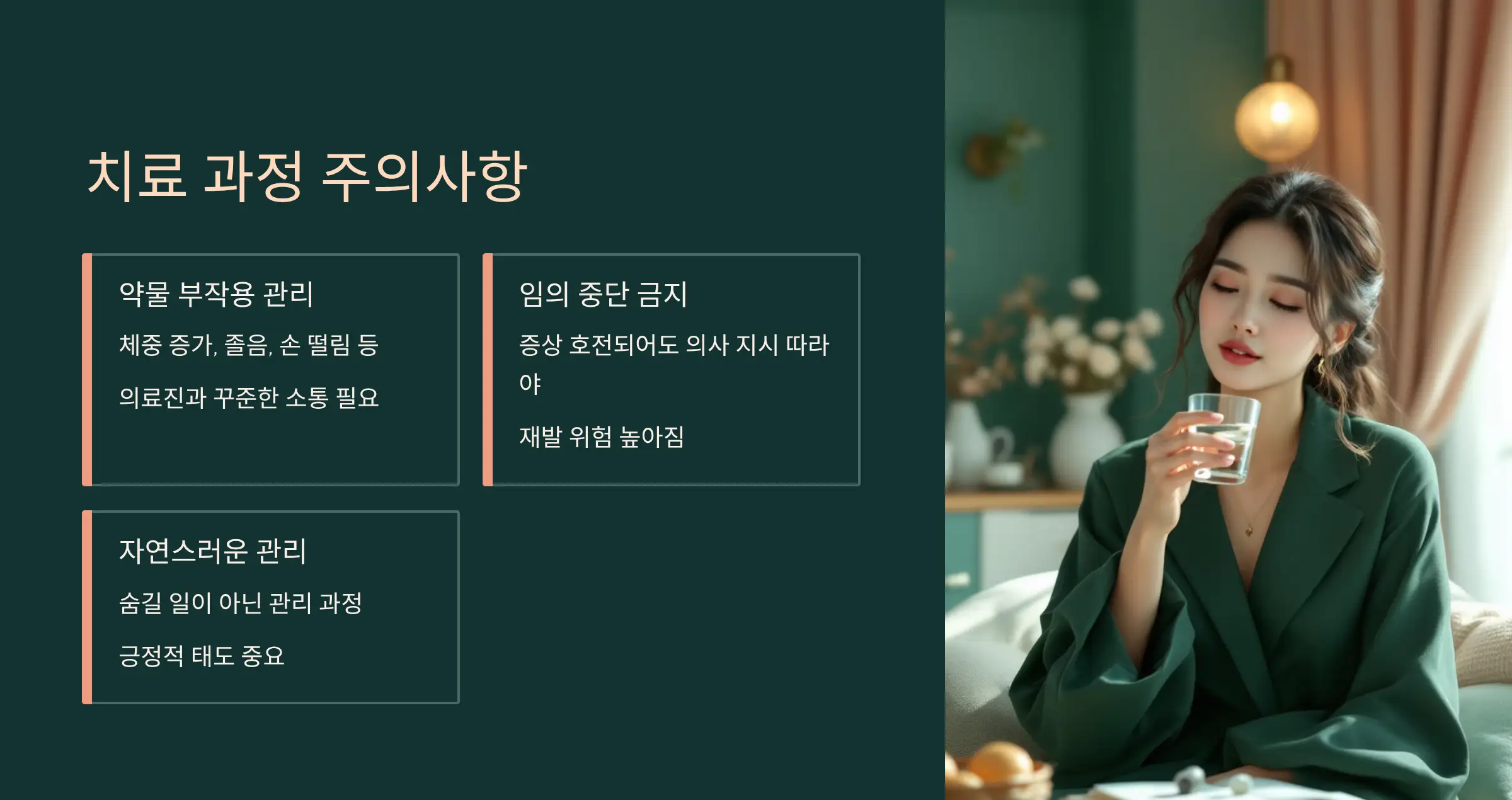 조현증 치료 과정에서는 약물 부작용 관리가 큰 비중을 차지해요. 체중 증가, 졸음, 불안, 손 떨림 등이 나타날 수 있으므로 의료진과의 꾸준한 소통이 필요합니다. 또, 증상이 호전되었다고 임의로 약을 중단하면 재발 위험이 높아집니다. 따라서 약물 복용은 반드시 의사의 지시에 따라야 합니다. 무엇보다 중요한 것은 치료를 '숨겨야 할 일이 아닌 자연스러운 관리 과정'으로 받아들이는 태도입니다.
