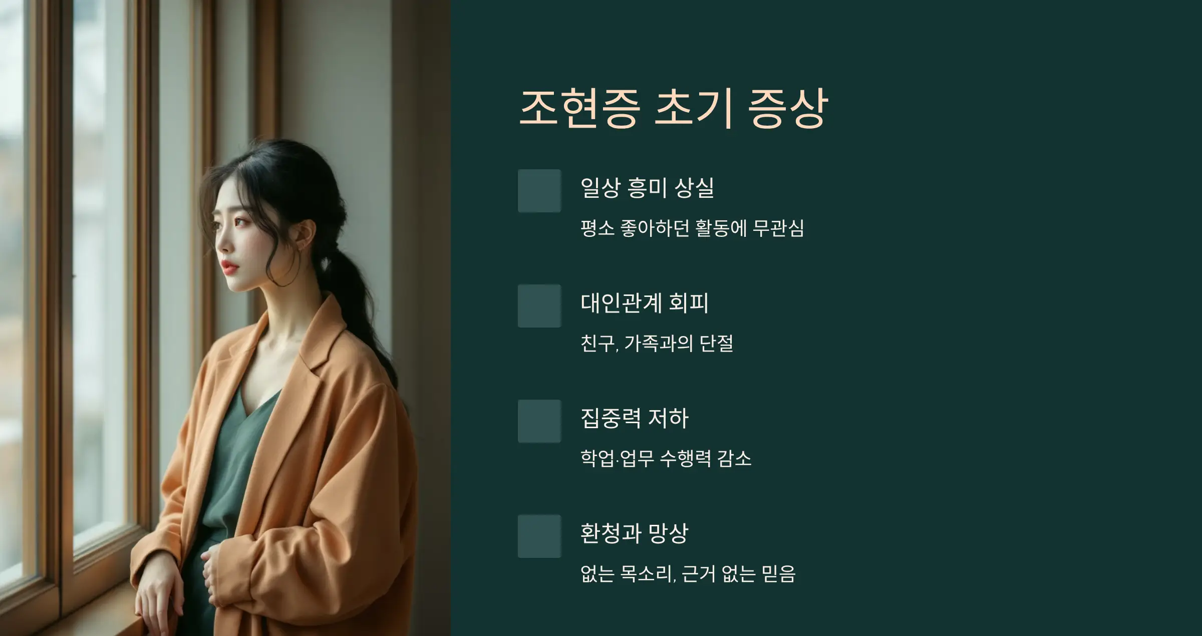 조현증 초기에는 대체로 성격 변화나 일상 습관의 변화가 먼저 나타나요. 대표적인 증상은 다음과 같습니다.