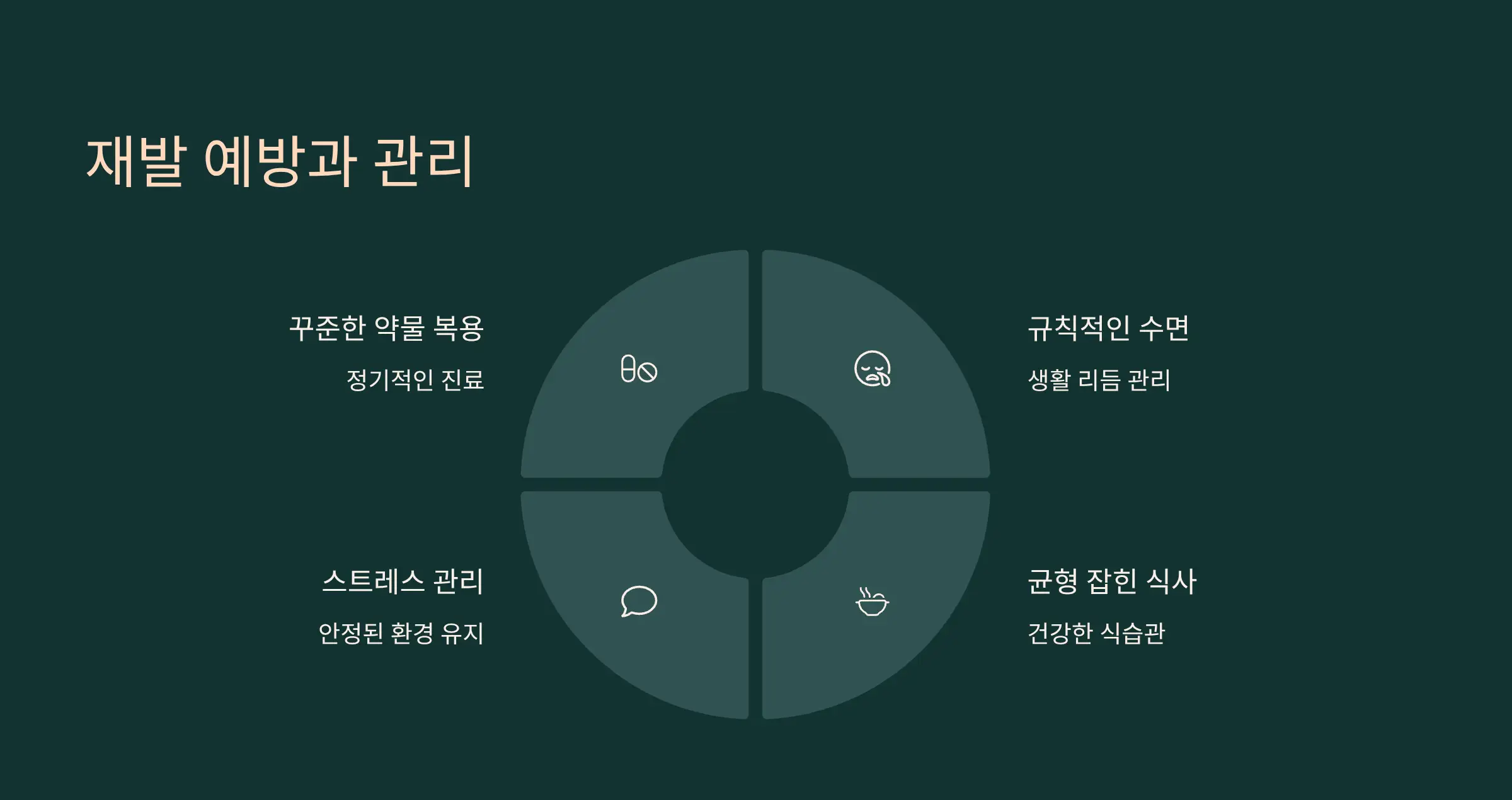 재발 예방은 조현증 관리의 핵심이에요. 꾸준한 약물 복용, 정기적인 진료, 생활 습관 관리(규칙적인 수면, 균형 잡힌 식사, 스트레스 관리)가 중요합니다. 특히 스트레스를 최소화할 수 있는 환경을 유지하는 것이 도움이 됩니다. 최근에는 디지털 헬스케어 앱을 활용해 증상 변화를 기록하고 관리하는 사례도 늘고 있어요. 장기적인 관리와 예방이 조현증 환자의 삶의 질을 높이는 핵심입니다.
