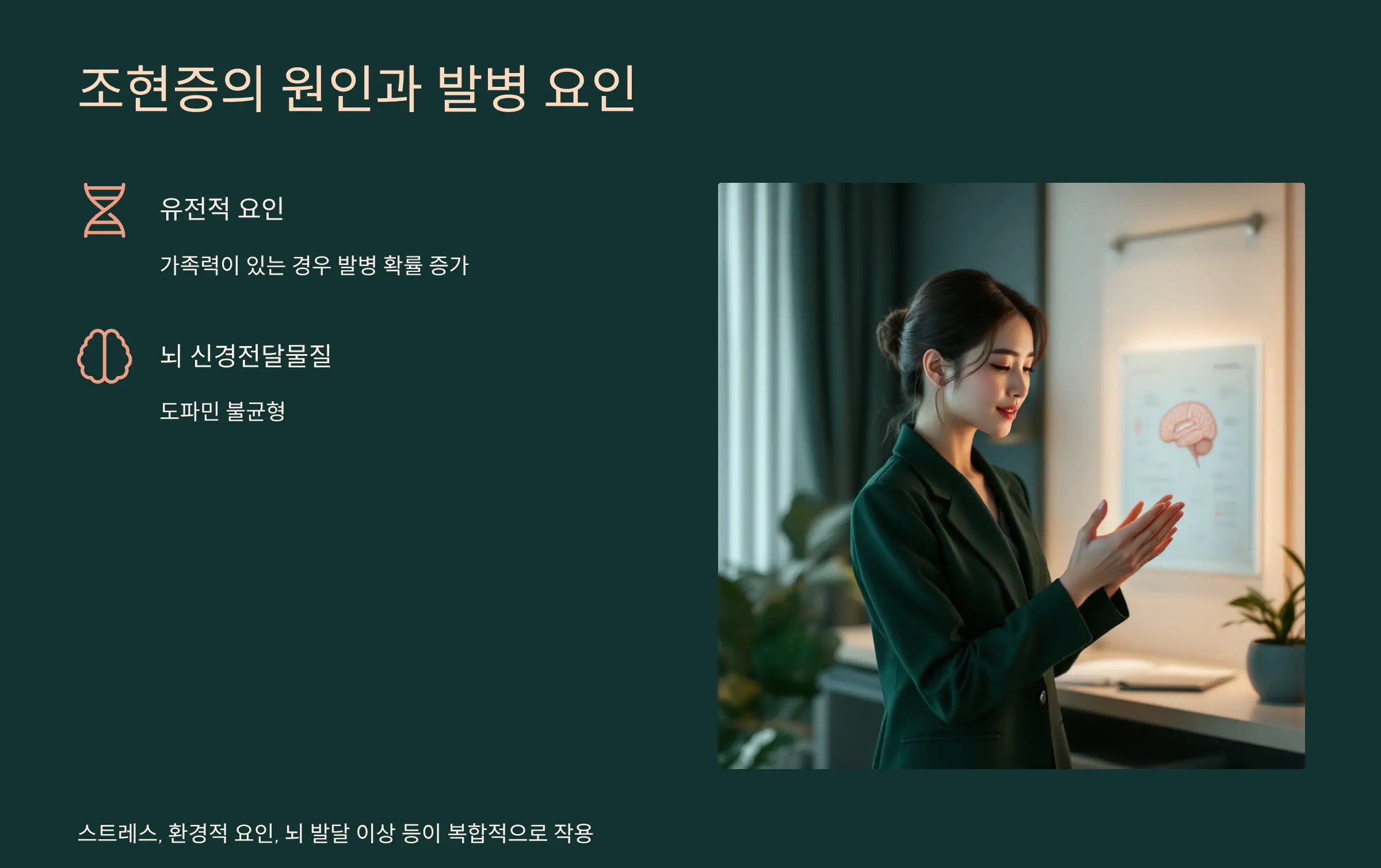 조현증의 원인은 아직 명확히 밝혀지지 않았지만 여러 요인이 복합적으로 작용한다고 알려져 있어요. 유전적 요인, 뇌 신경전달물질의 불균형(특히 도파민), 스트레스나 환경적 요인, 출생 전후의 뇌 발달 이상 등이 주요 요인으로 지목됩니다. 특히 가족력이 있는 경우 발병 확률이 높아질 수 있어, 유전적 요인이 중요한 역할을 한다고 연구 결과가 말해주고 있습니다.