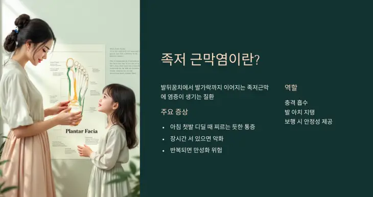 족저 근막염은 발뒤꿈치에서 발가락까지 이어지는 두꺼운 결합조직인 ‘족저근막’에 염증이 생기는 질환입니다. 이 부위는 우리가 걷거나 뛸 때 충격을 흡수하고 발의 아치를 지탱하는 역할을 합니다. 하지만 장시간 서 있거나, 잘못된 신발을 신거나, 과도한 운동을 하면 족저근막에 반복적인 미세 손상이 쌓여 염증이 발생하게 됩니다.