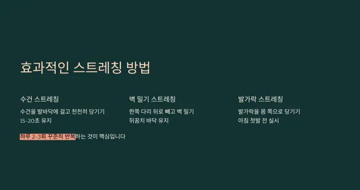 족저 근막염 치료의 핵심은 ‘근막의 유연성 회복’입니다. 스트레칭은 염증 부위에 직접적인 자극을 줄이지 않으면서도 혈류를 개선하고 회복 속도를 높이는 데 효과적입니다.