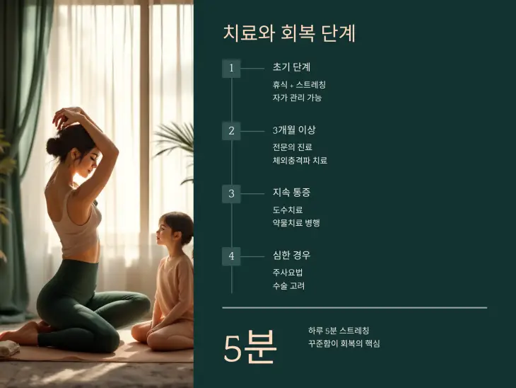 심한 경우에는 주사요법이나 수술을 고려하기도 하지만, 대부분은 비수술적 치료로 호전됩니다. 중요한 것은 꾸준함입니다. 하루에 5분이라도 스트레칭을 지속하는 것이 회복의 핵심이에요.