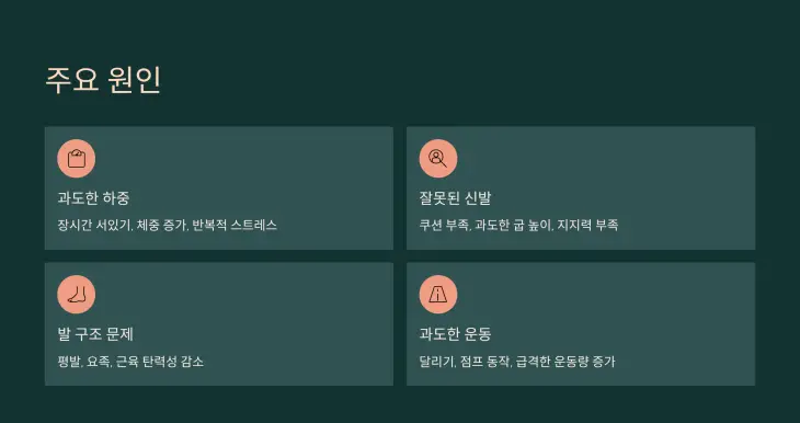 족저 근막염의 원인은 다양하지만, 가장 큰 원인은 과도한 하중과 반복적 스트레스입니다. 장시간 서 있는 직업, 달리기나 점프 동작이 잦은 운동, 체중 증가 등이 발바닥 근막에 부담을 줍니다.