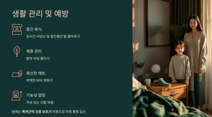 족저 근막염은 치료보다 예방이 훨씬 쉽습니다. 평소 발에 무리가 가지 않도록 생활습관을 관리하는 것이 중요합니다.