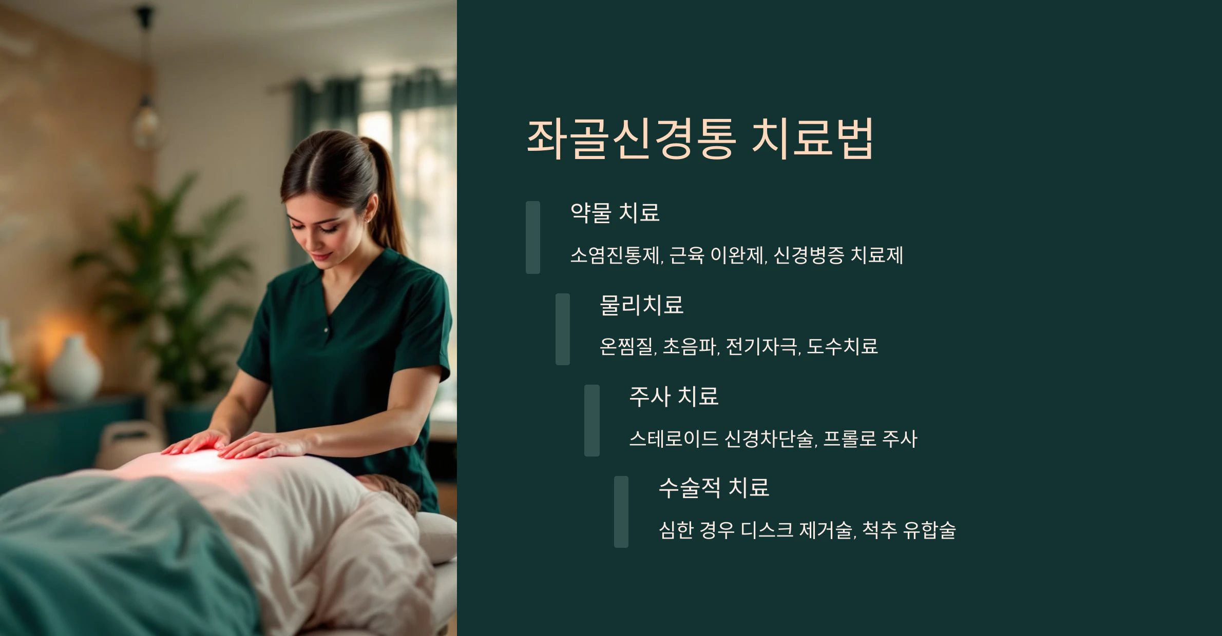 좌골신경통 치료는 비수술적 치료부터 수술적 치료까지 다양해요.