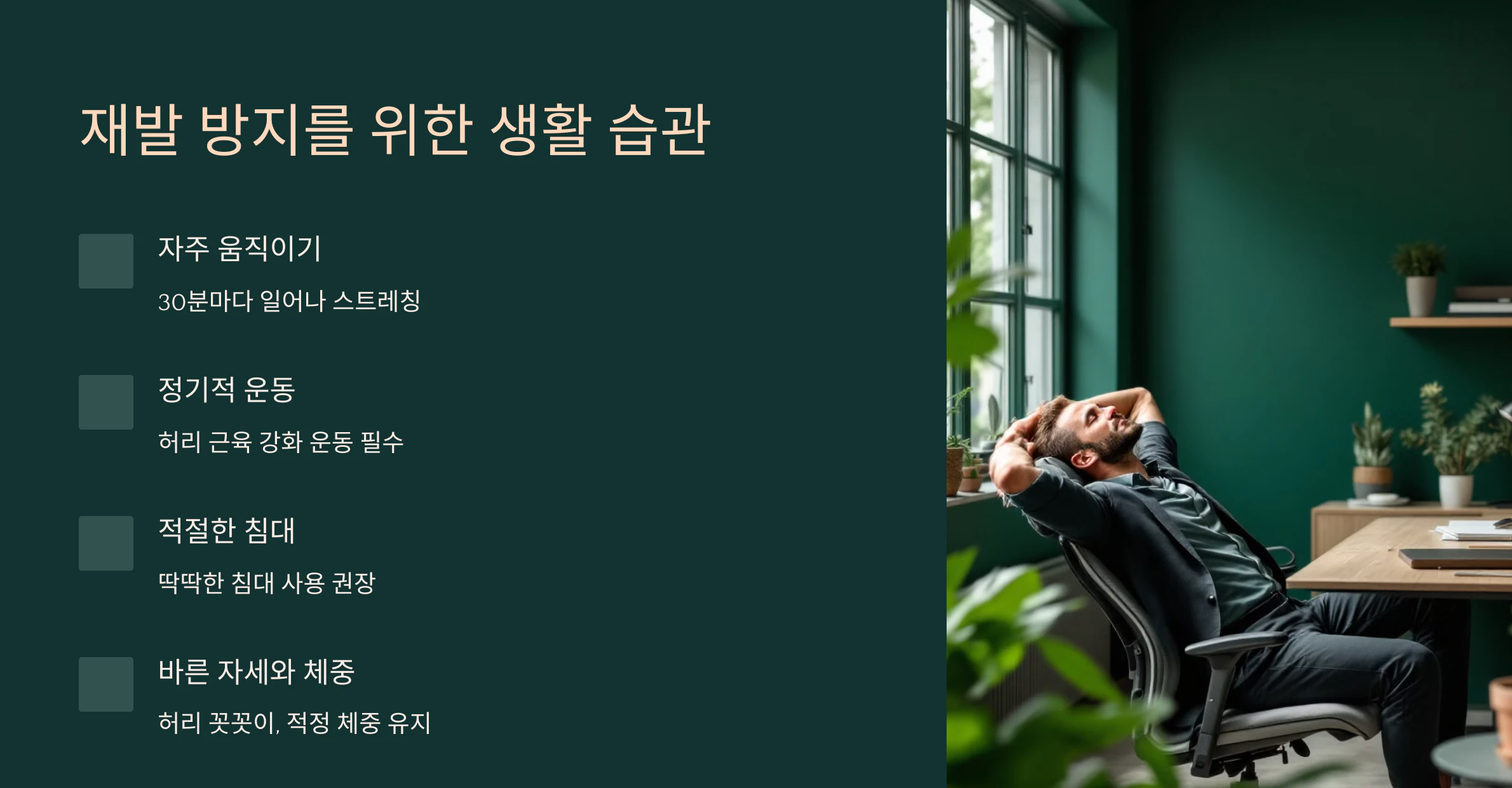 좌골신경통은 쉽게 재발할 수 있기 때문에 생활 속 관리가 중요해요!