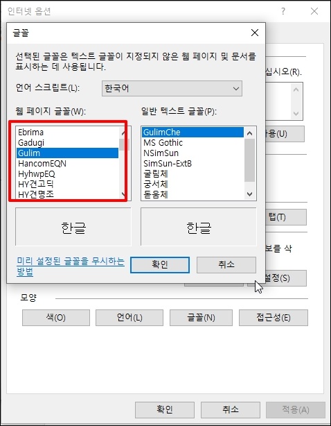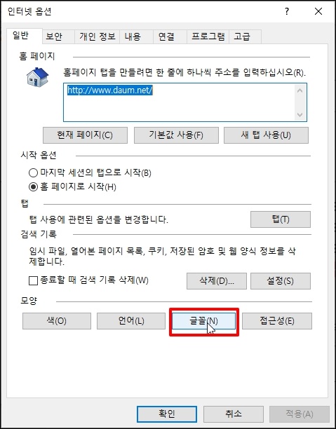 "인터넷 옵션"창이 나타나면 "글꼴" 버튼을 클릭합니다.