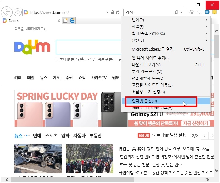 인터넷 브라우저에서만 변경하는 경우 레지스트리를 수정하지 않고 Internet Explorer에서 변경할 수 있습니다. Internet Explorer에서 기어의 오른쪽 위 모서리에있는 설정을 클릭 한 다음 "인터넷 옵션"을 선택합니다.