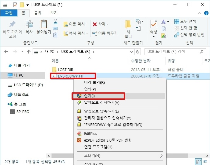 글꼴을 다운로드 한 후 글꼴 파일을 마우스 오른쪽 버튼으로 클릭하고 "설치"버튼을 클릭합니다.
