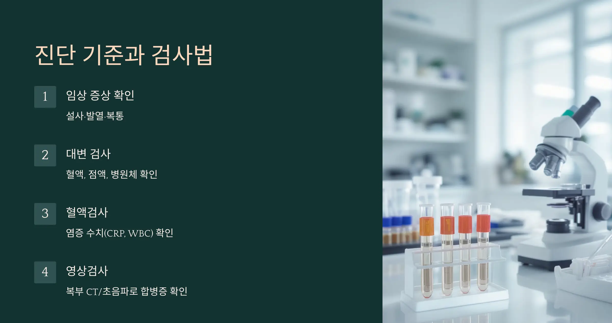 - 혈액검사: 염증 수치(CRP, WBC) 확인