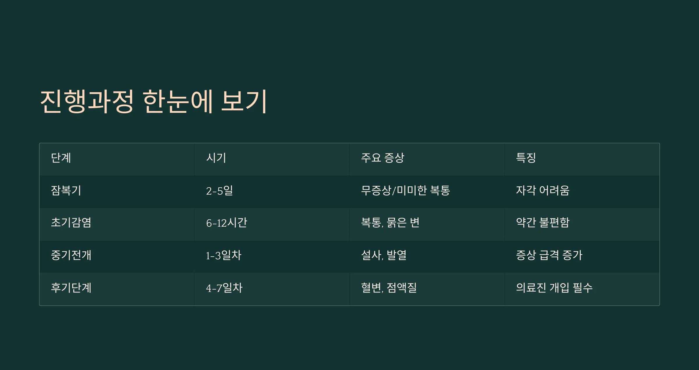 | 후기단계 | 4~7일차 | 혈변, 점액질 배출 | 의료진 개입 필수, 합병증 주의 |