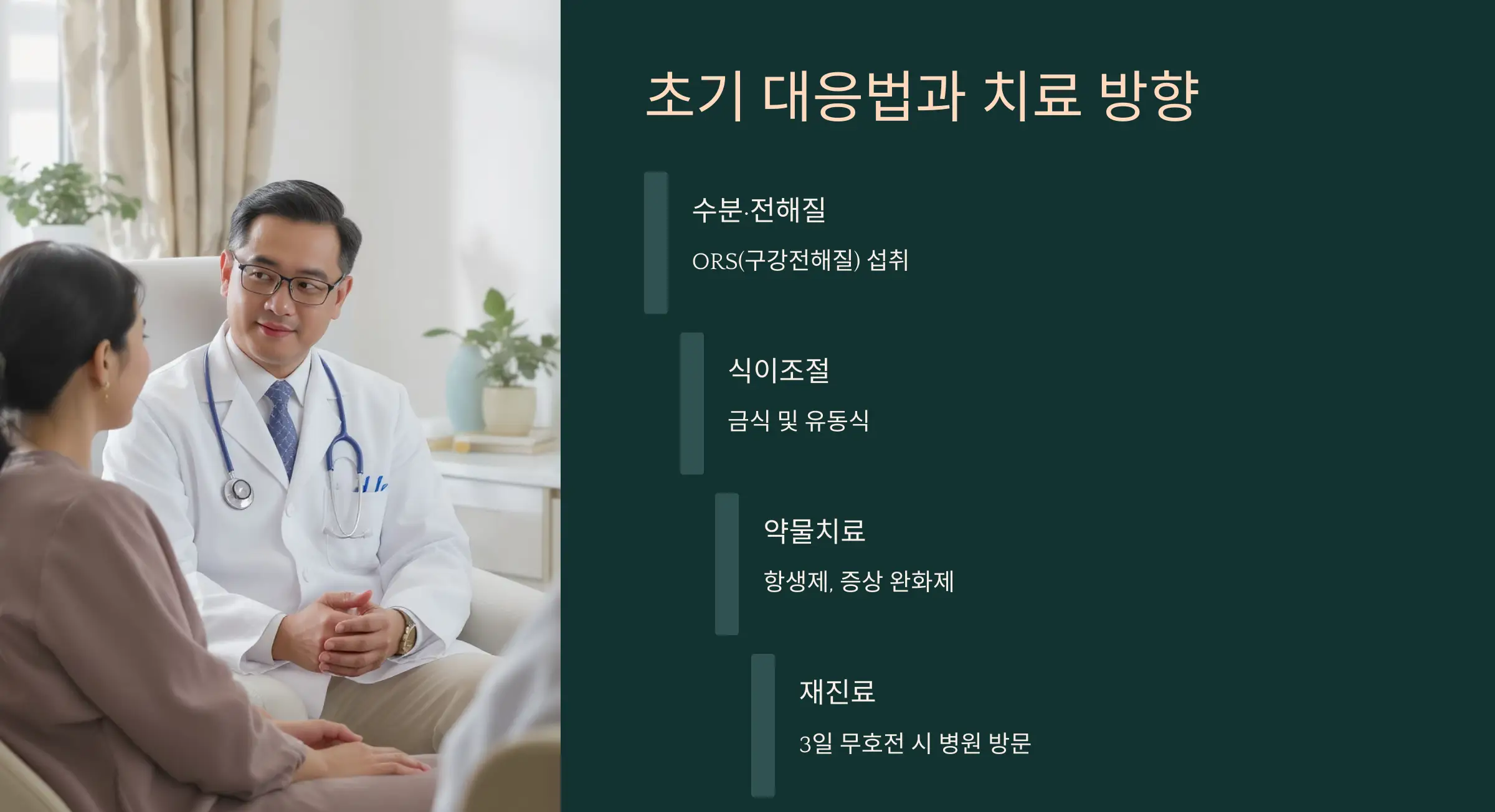 - 수분·전해질 섭취: ORS(구강전해질) 추천