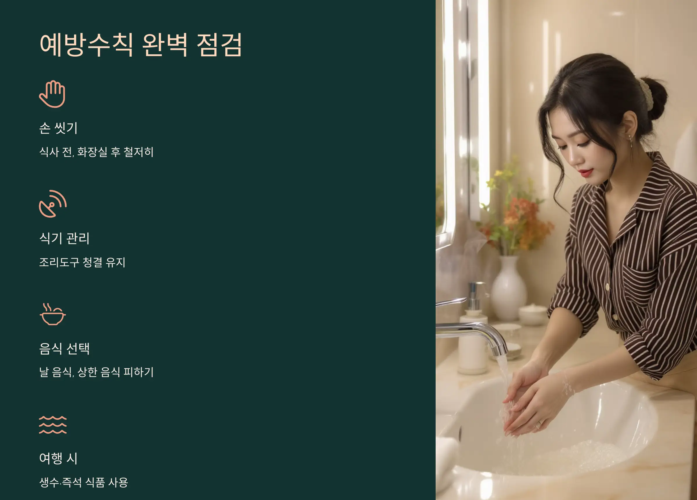 - ✅ 손 씻기 철저히 (식사 전, 화장실 후)