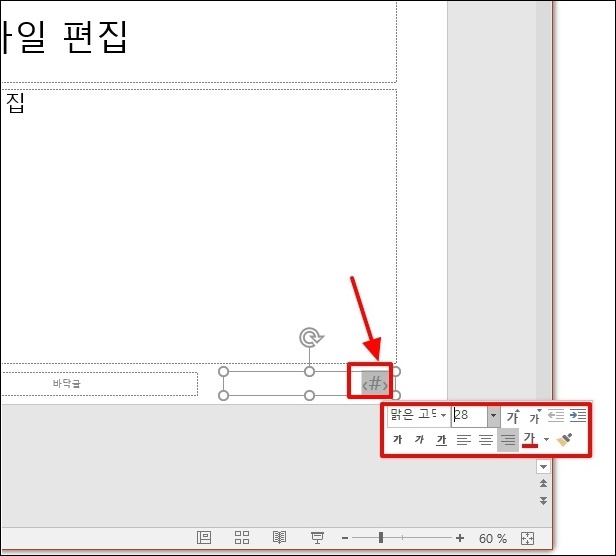 큰 첫 번째 슬라이드를 선택할 때 페이지 번호는 오른쪽 하단에있는 <#>입니다. 글꼴 색상 및 글꼴 크기를 변경할 수 있습니다. 페이지 번호 <#>를 드래그 한 다음 마우스 오른쪽 버튼을 클릭합니다. 필요에 따라 글꼴, 크기 및 색상을 변경할 수 있습니다.