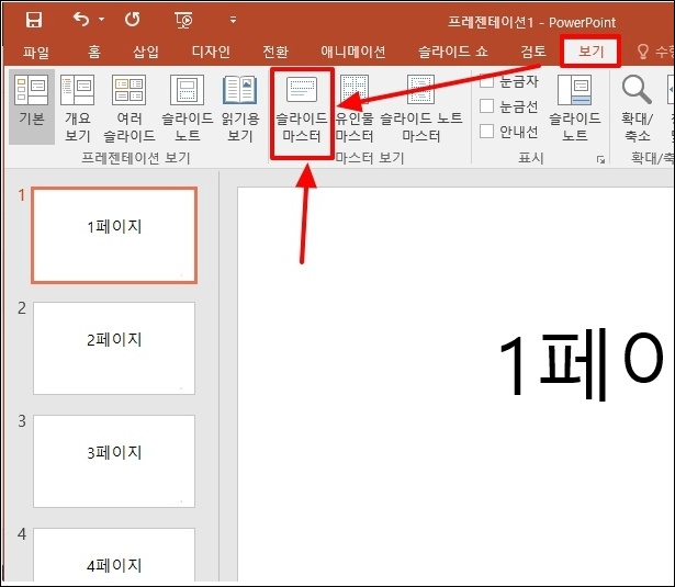 페이지 번호의 글꼴과 크기를 변경해 보겠습니다. 상단 "보기" 메뉴에서 "슬라이드 마스터"를 클릭합니다.