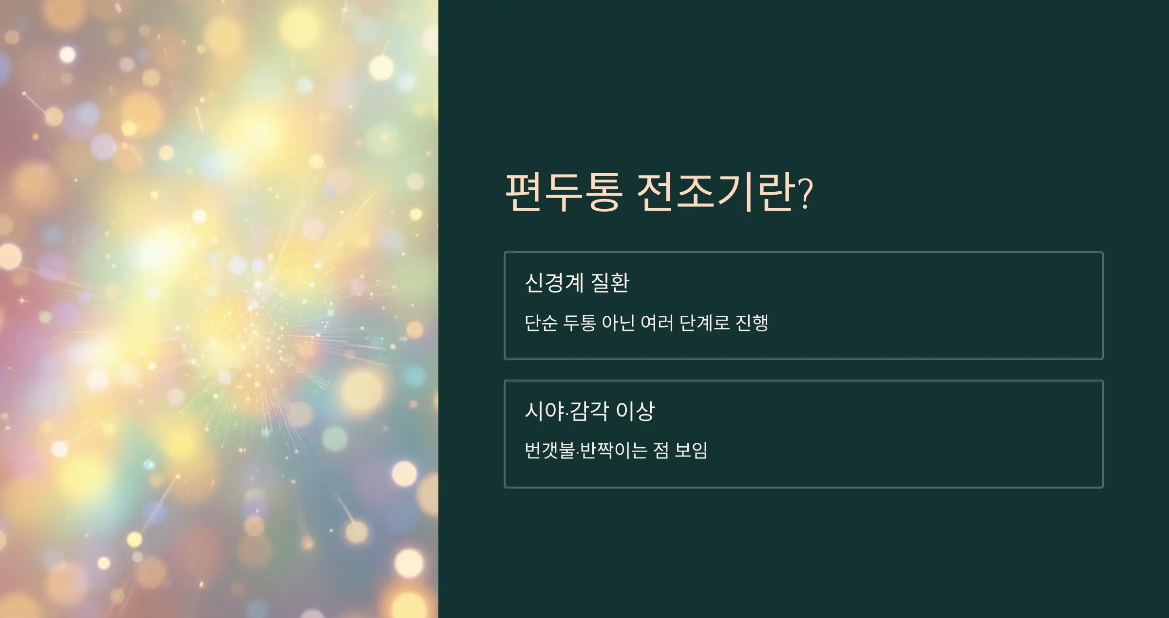 그중 전조기(포리몬증상)에는 시야·감각·신경 신호의 작은 이상이 나타납니다.