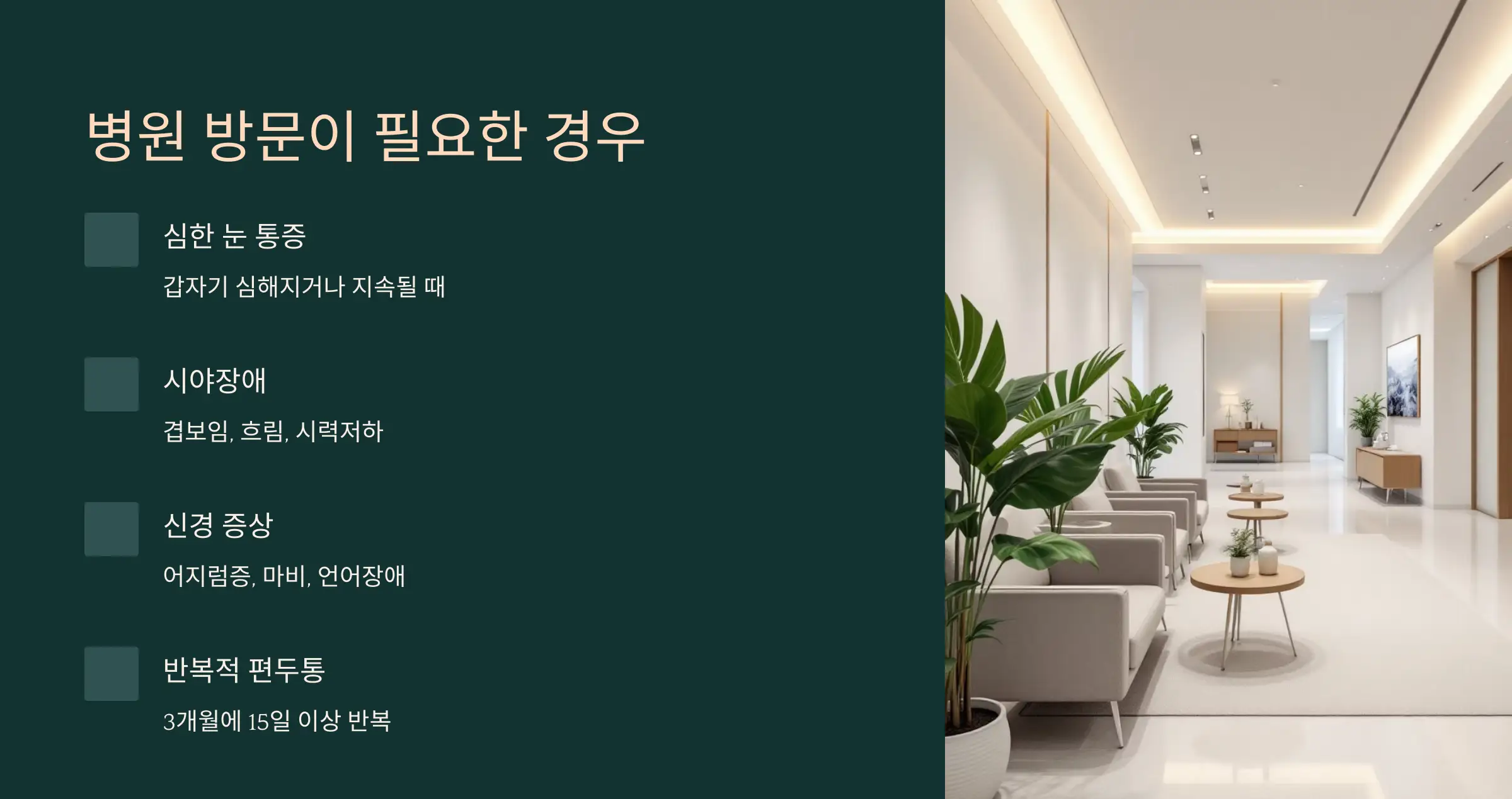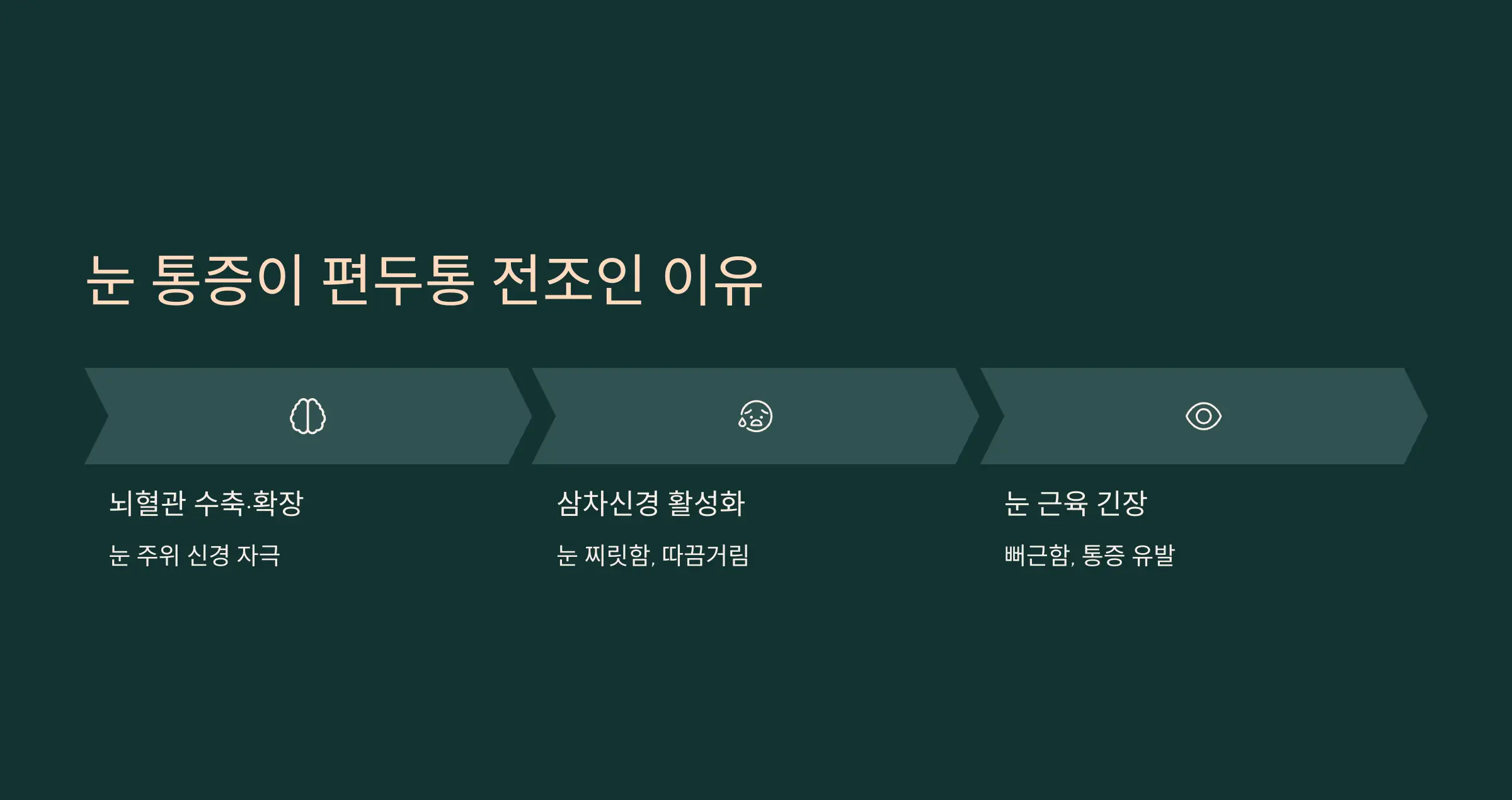 - 뇌혈관 수축과 확장: 편두통 시 뇌 혈관이 급격히 변하면서 눈 주위 신경이 자극되어 통증과 불편감이 생깁니다.
