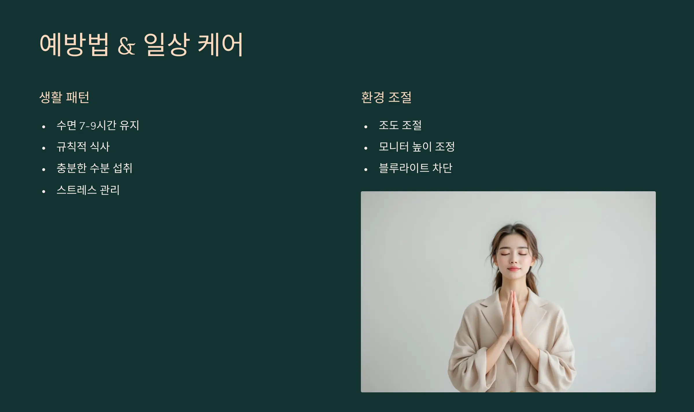 - 눈 휴식 루틴: 20분마다 20초간 먼 곳 보기 또는 눈 감고 휴식