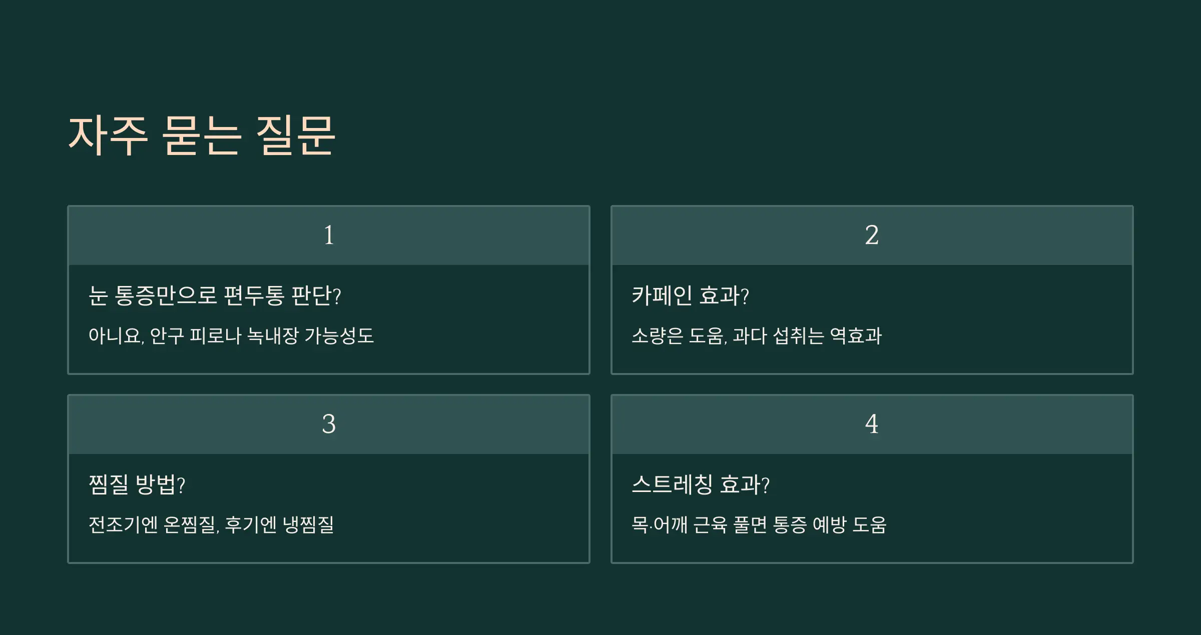 - 네, 목·어깨 근육 긴장을 미리 풀어주면 눈 주변 통증과 두통 발생을 줄이는 데 도움이 됩니다.