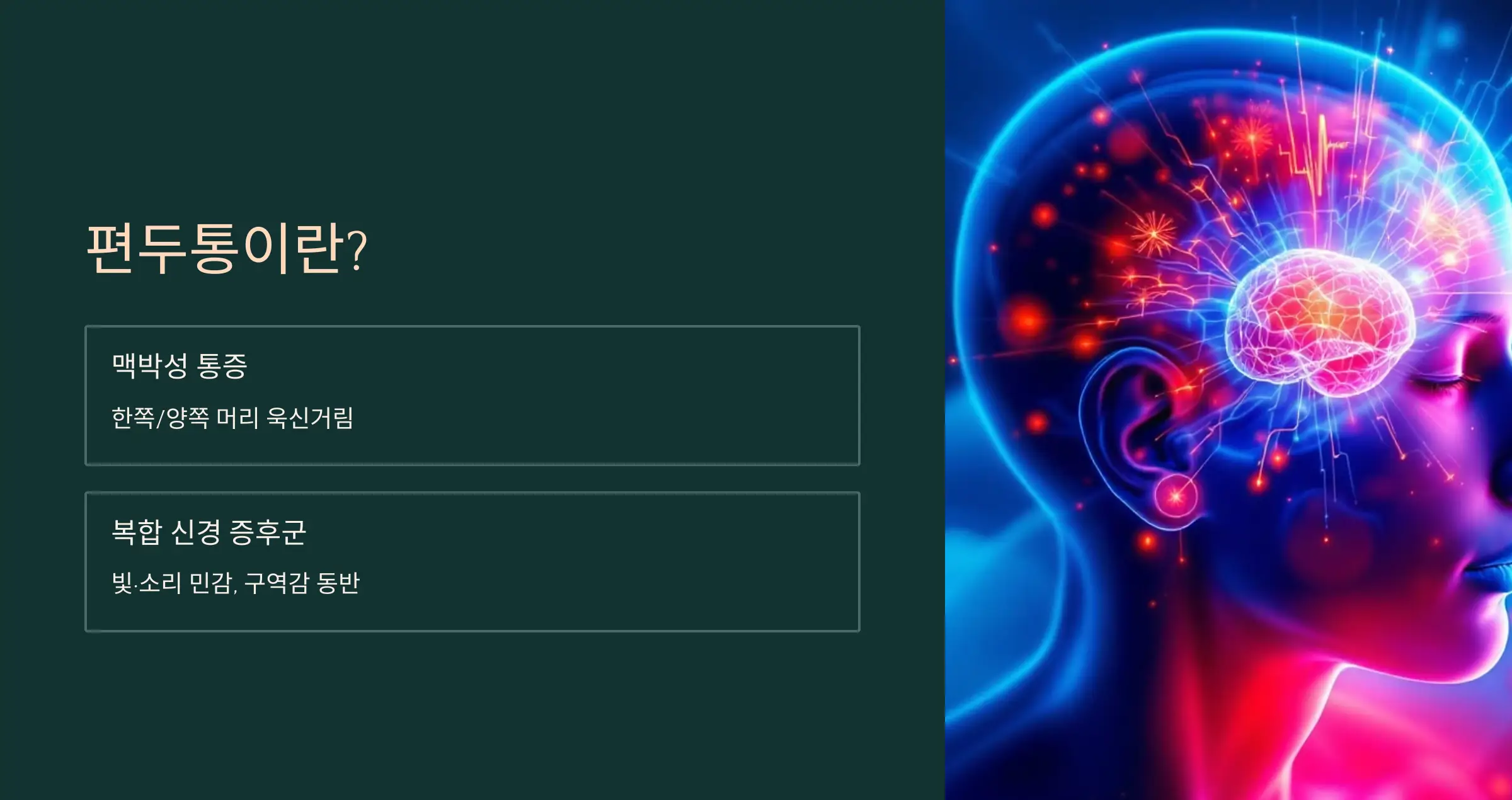 편두통은 한쪽 혹은 양쪽 머리에서 느껴지는 맥박성 통증으로, 단순 두통 이상의 복합적 신경 증후군이에요.