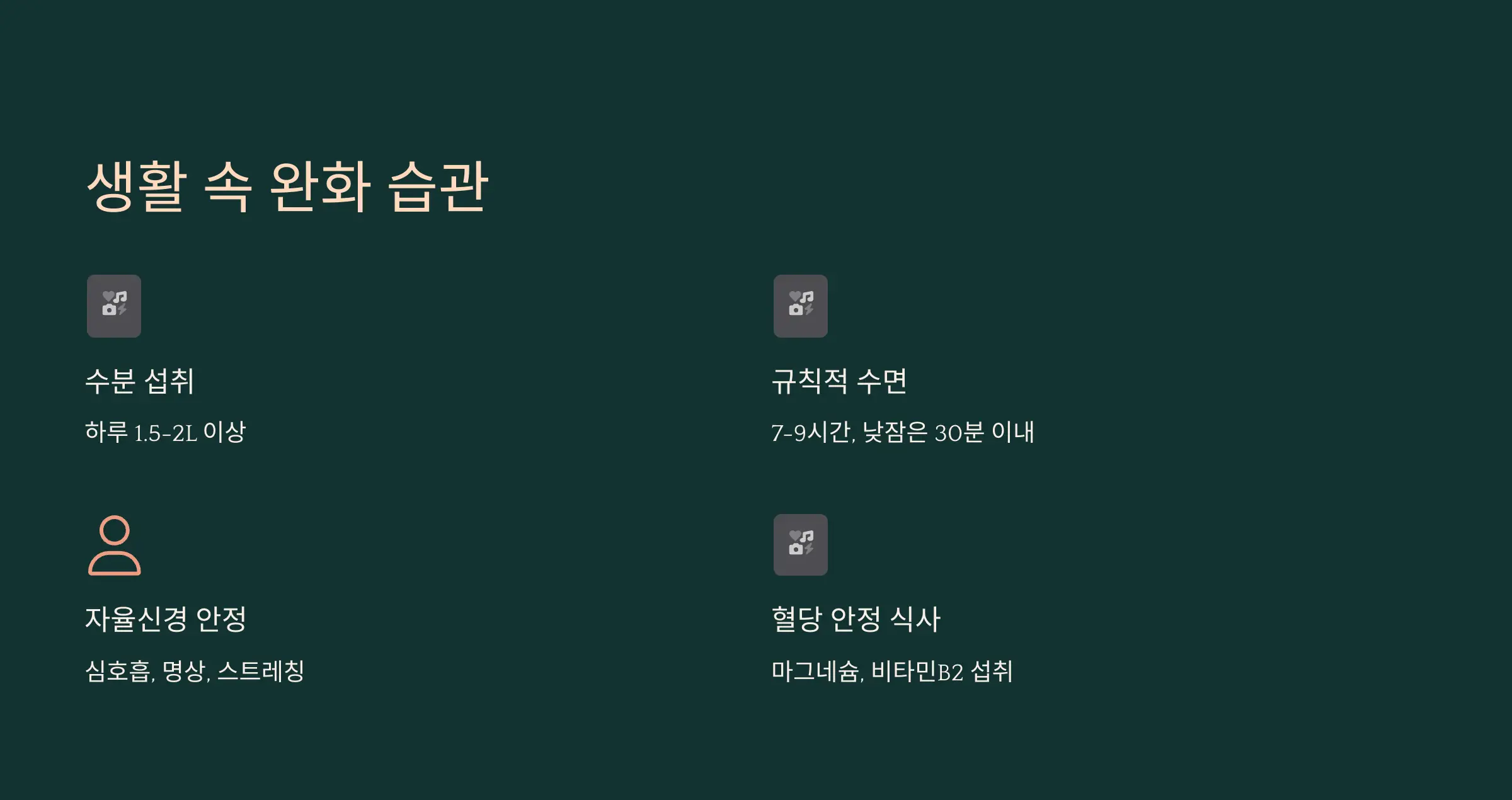 - 하루 7~9시간 수면 리듬을 지키면 스트레스와 편두통 발생 빈도를 줄일 수 있어요.