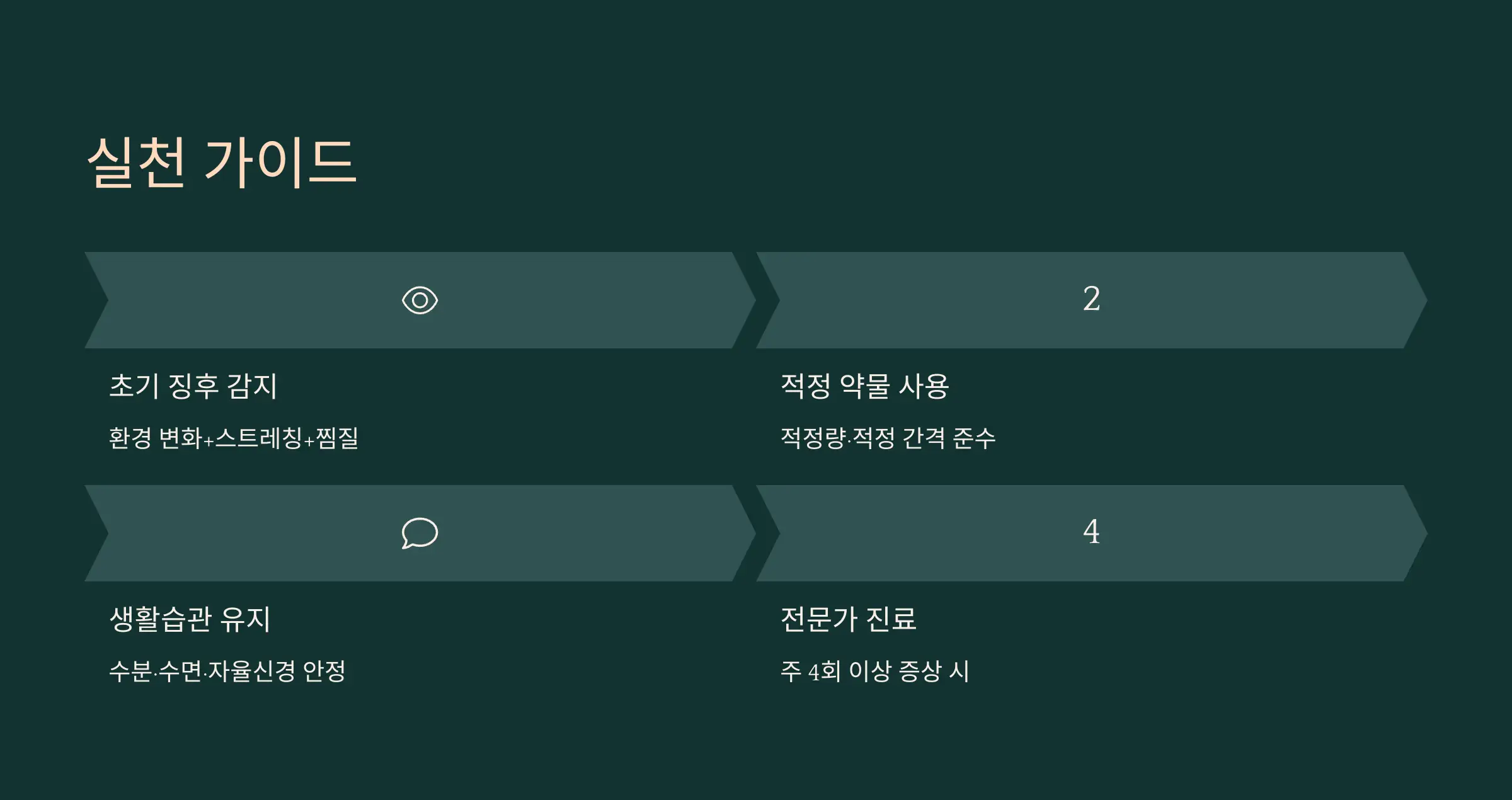- 통증이 시작되기 전 눈부심·어지럼·빛점·손끝 저림 같은 전조 증상이 있다면 초기에 접근하는 게 중요합니다.
