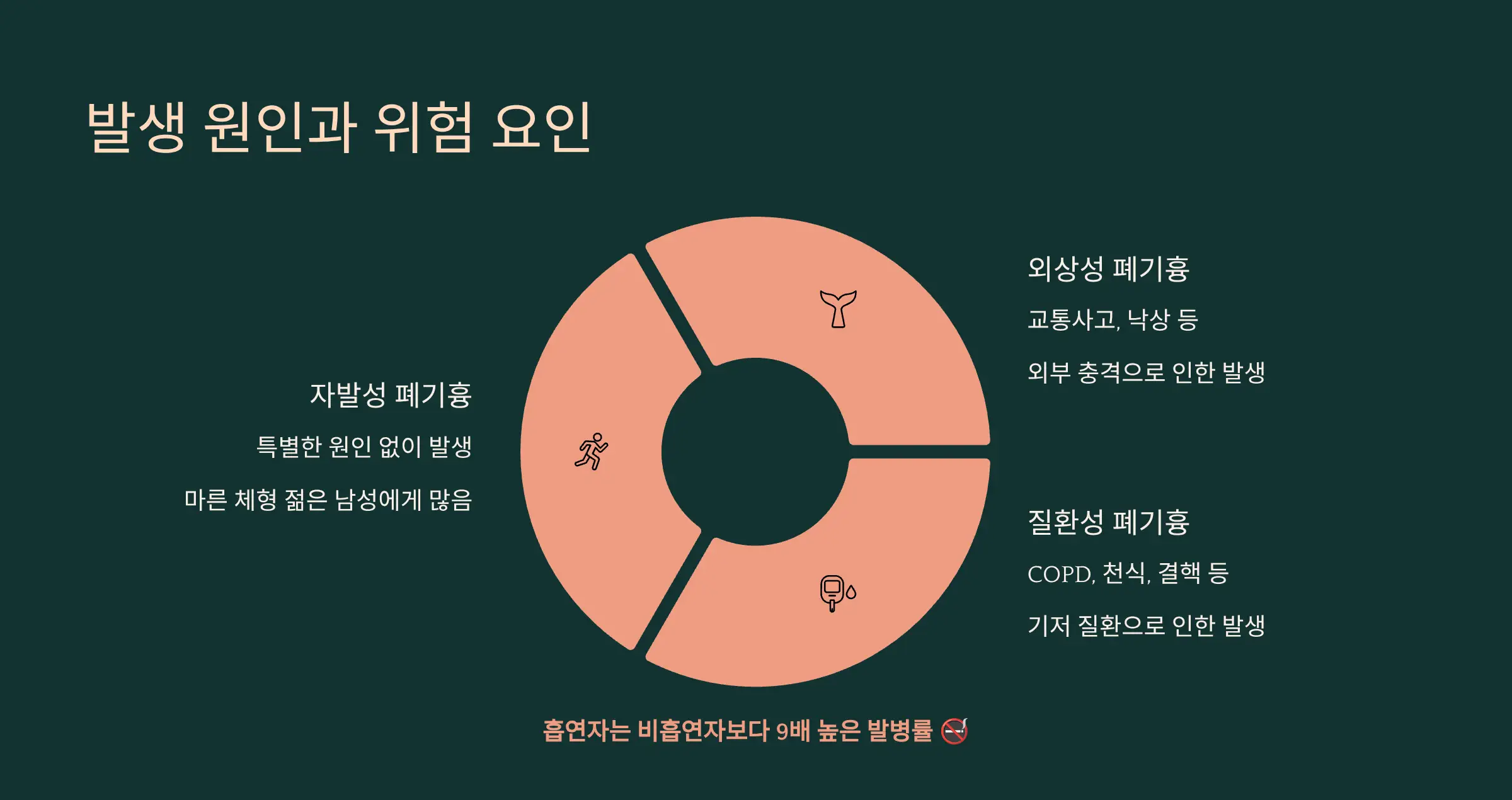 - 질환성 폐기흉: 만성폐쇄성폐질환(COPD), 천식, 결핵 등 기저 질환으로 인해 발생.