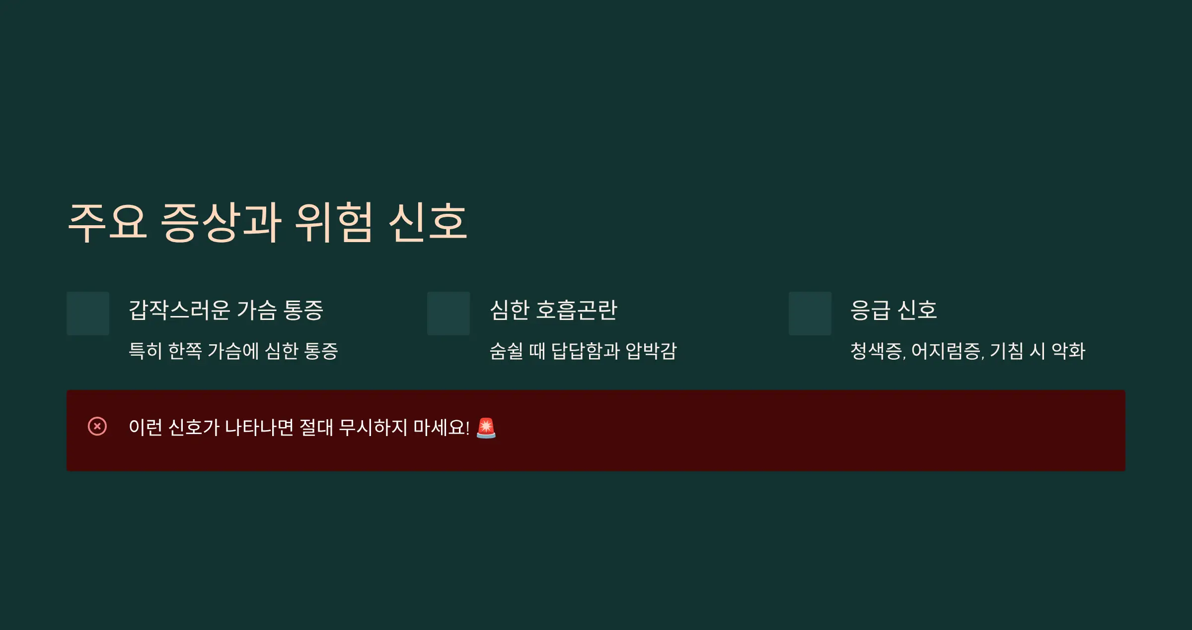 - 갑작스럽게 숨쉬기 힘들어지고 흉통이 심해진다면 바로 응급실로 이동해야 합니다.