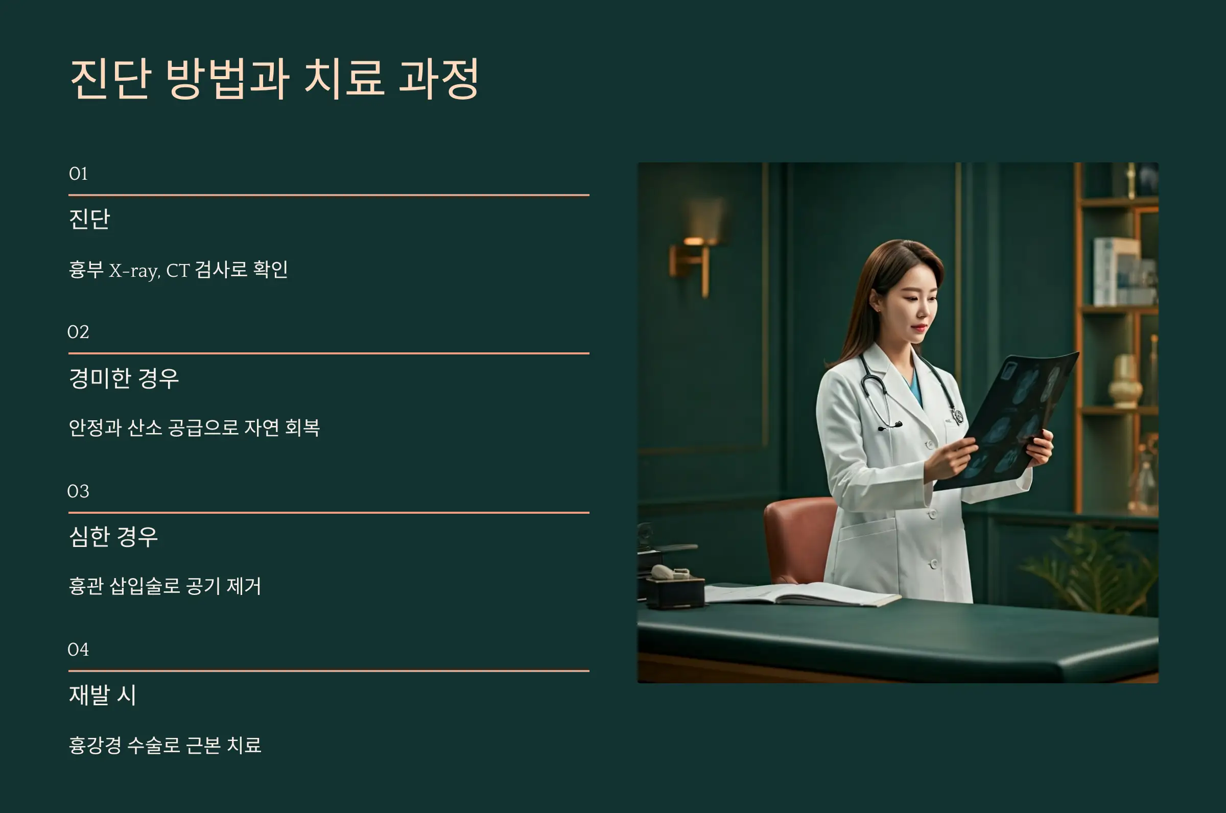 폐기흉은 시간과의 싸움이기 때문에 ‘조금 쉬면 나아지겠지’라는 생각은 금물입니다.