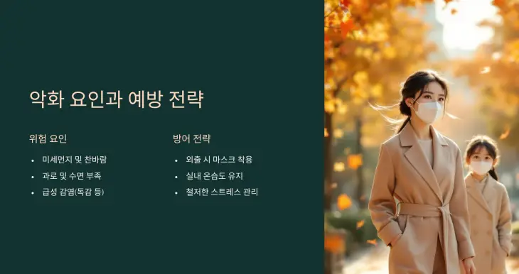 먼지·곰팡이·미세먼지는 기도를 자극하므로 공기청정기 사용, 자주 환기, 습도 조절이 필수예요.