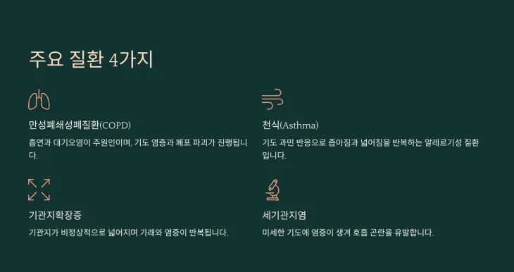 이 네 가지는 원인은 다르지만 ‘공기가 드나드는 길이 좁아지고 꺾인다’는 공통점을 가지고 있기 때문에 관리 방식도 서로 연결되는 부분이 많습니다.