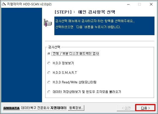 "검사 선택"에서 "전체 / 부분 디스크 배드섹터 섹터 검사"를 선택하고 "다음"을 클릭합니다.