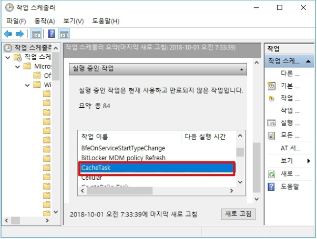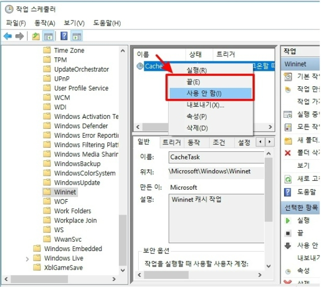 여기에서 CacheTask를 마우스 오른쪽 버튼으로 클릭하고 "사용 안 함(I)"를 선택합니다.
