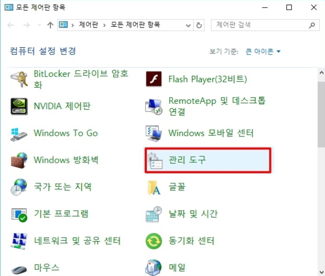 제어판 창이 나타나면 항목 중 관리 도구를 선택합니다. 관리 도구가 보이지 않으면보기 상태를 "큰 아이콘"으로 변경하세요.