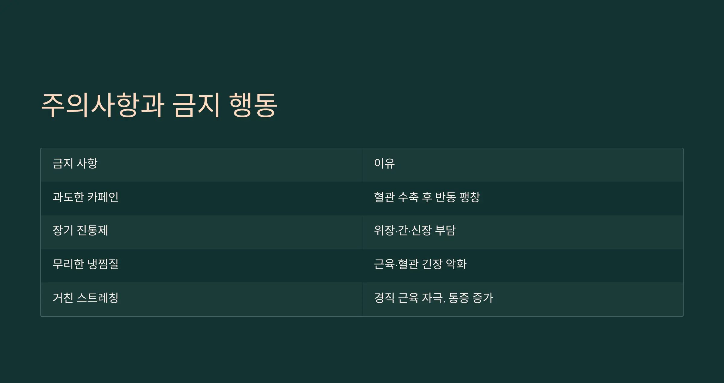 | 거친 스트레칭 | 경직된 근육에 자극, 통증 증가 위험 |