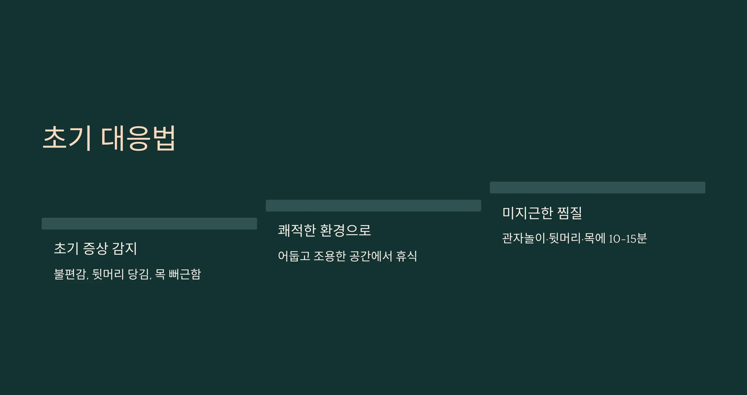 - 관자놀이·뒷머리·목 뒷부분에 10~15분간 따뜻한 찜질을 해주세요.