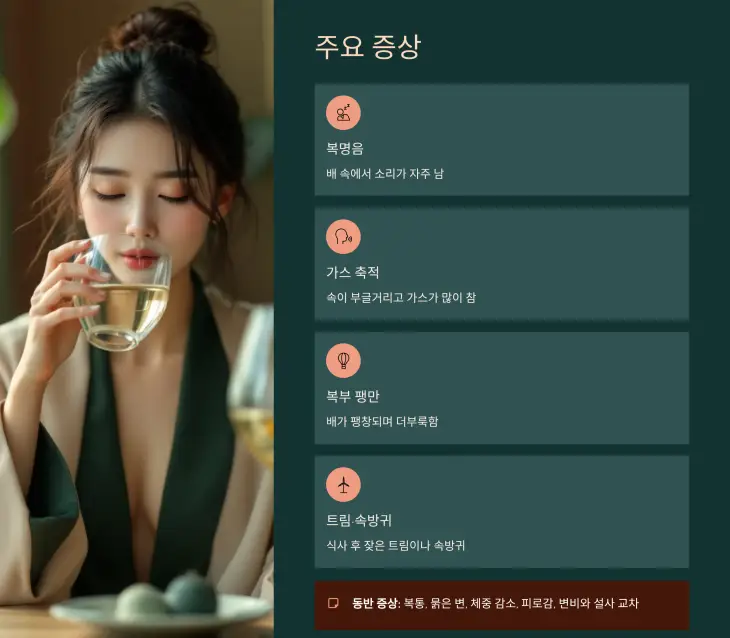 장이 과도하게 활동해 공기와 가스가 차오르며, ‘속방귀’나 복부팽만이 동반되기도 하지요.