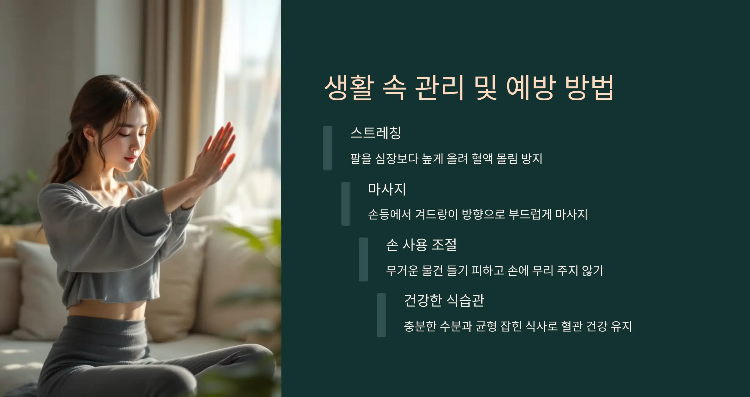 - 팔을 심장보다 높게 올리는 스트레칭: 혈액이 손끝에 몰리는 것을 방지합니다.